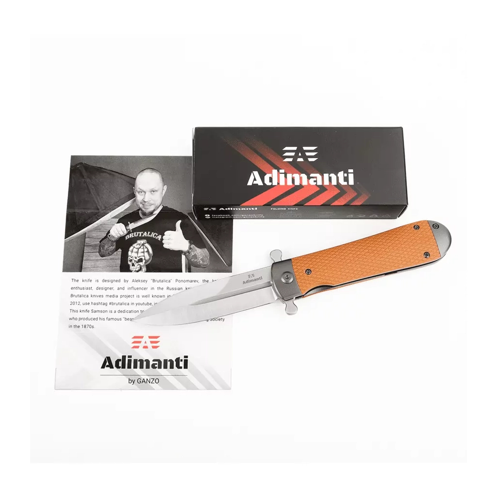 Модель Adimanti Samson-унікальний інструмент з рідкісною формою клинка Spear-Point, яка виділяється агресивно гострим кінчиком і фальшлезвием у верхній частині. Це складна модель, яка орієнтована на любителів практичних ножів з оригінальним дизайном і має розширені можливості з упором на силову роботу.