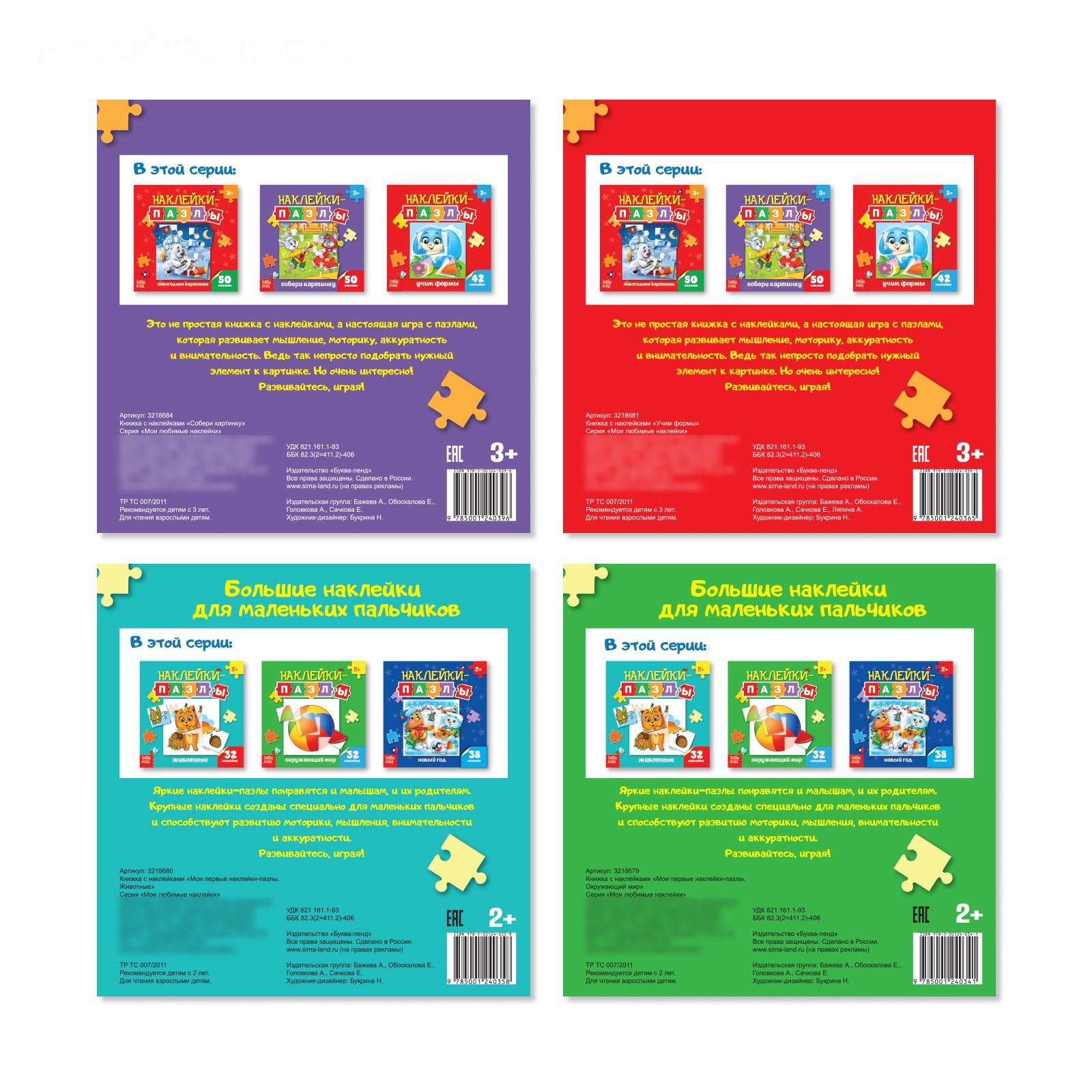 Набор книжек с наклейками-пазлами предназначен для самых маленьких читателей. Занятия с такими книгами тренируют мелкую моторику, пространственное мышление, логику и расширяют кругозор.
