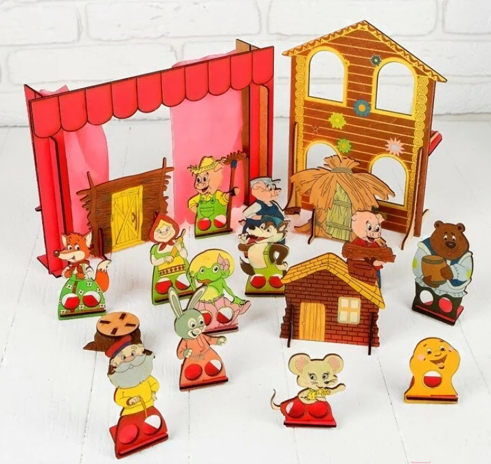 • В наборе ширма, декорация (5 шт.), сценарий, кукла на подставке (12 шт.)