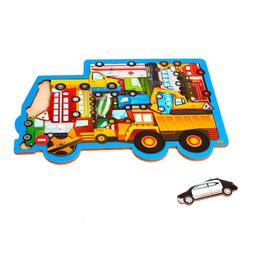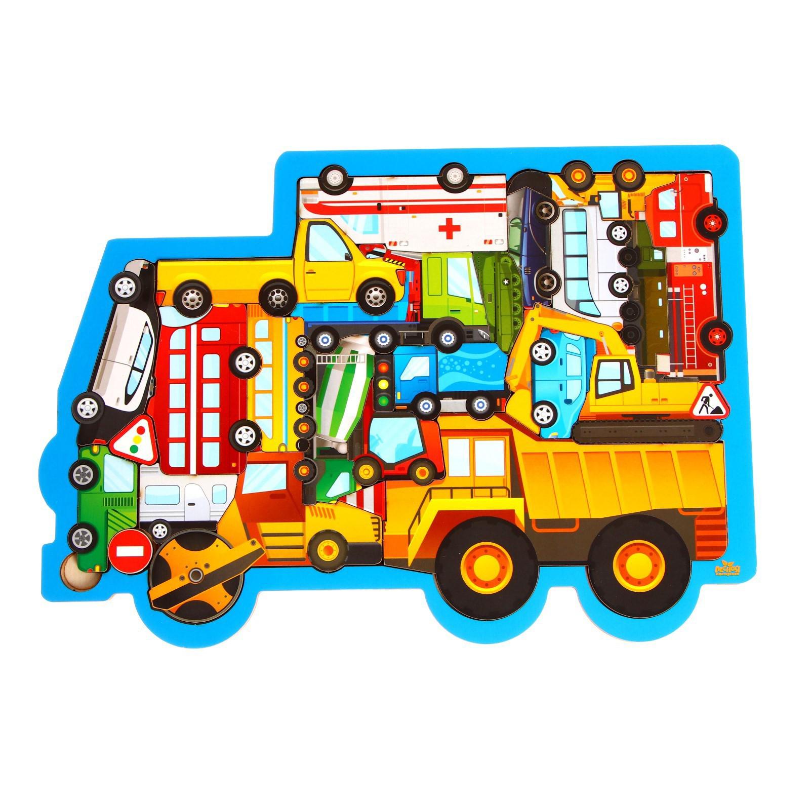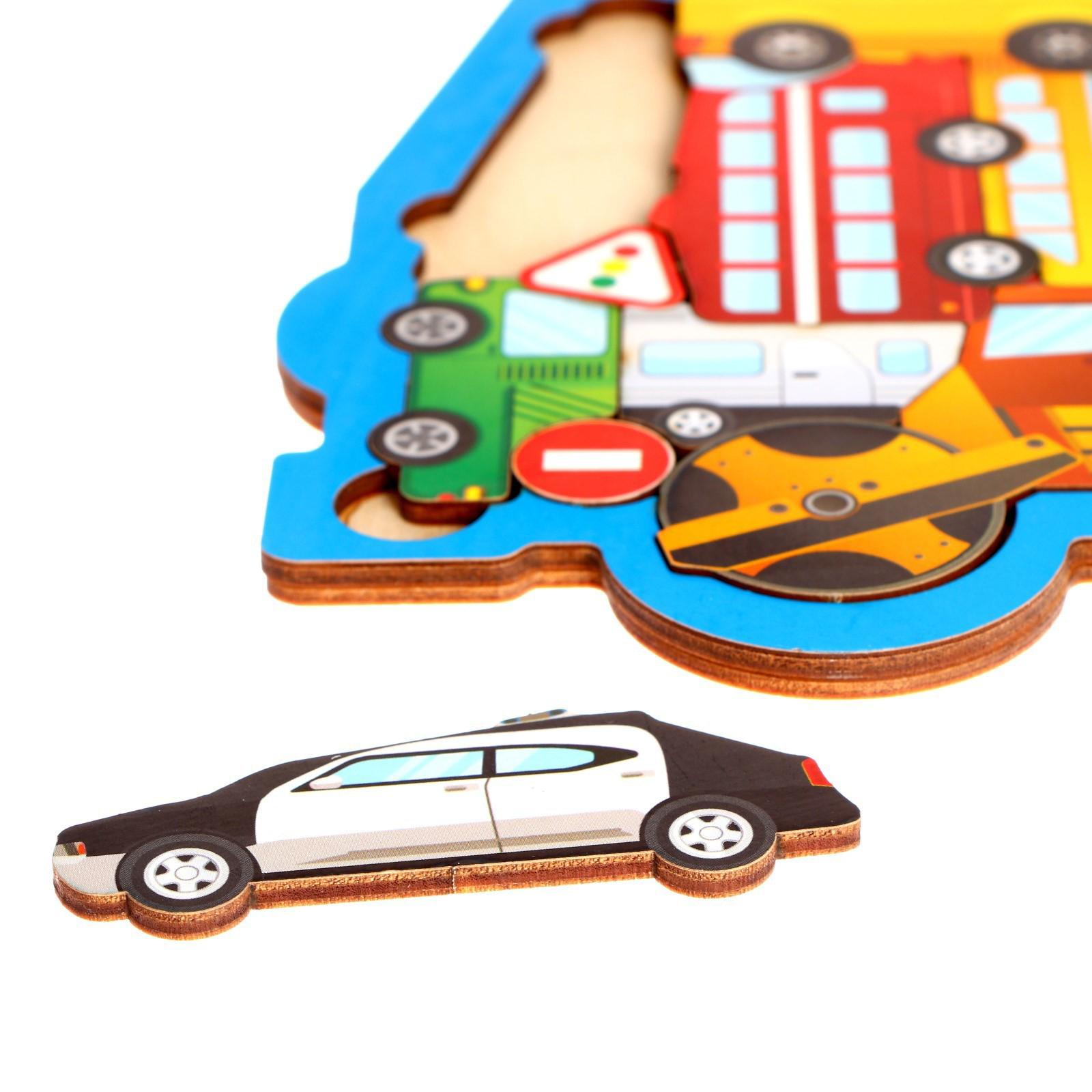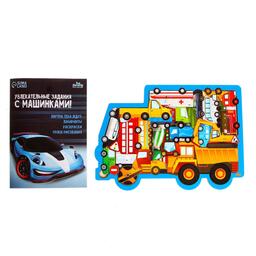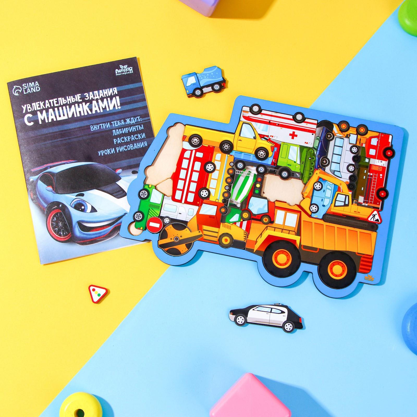 Набор «Машины» включает в себя головоломку в рамке и книгу с увлекательными заданиями.