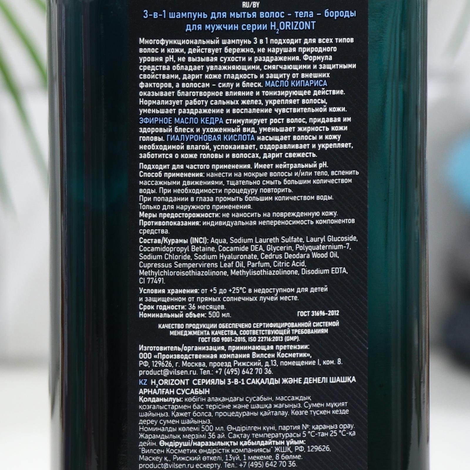 Шампунь для мытья волос 3-в-1; тела; бороды для мужчин серии H2ORIZONT. Многофункциональный шампунь 3 в 1 подходит для всех типов волос и кожи; действует бережно; не нарушая природного уровня pH; не вызывая сухости и раздражения. Формула средства обладает увлажняющими; смягчающими и защитными свойствами; дарит коже гладкость и защиту от внешних факторов; а волосам – силу и блеск.