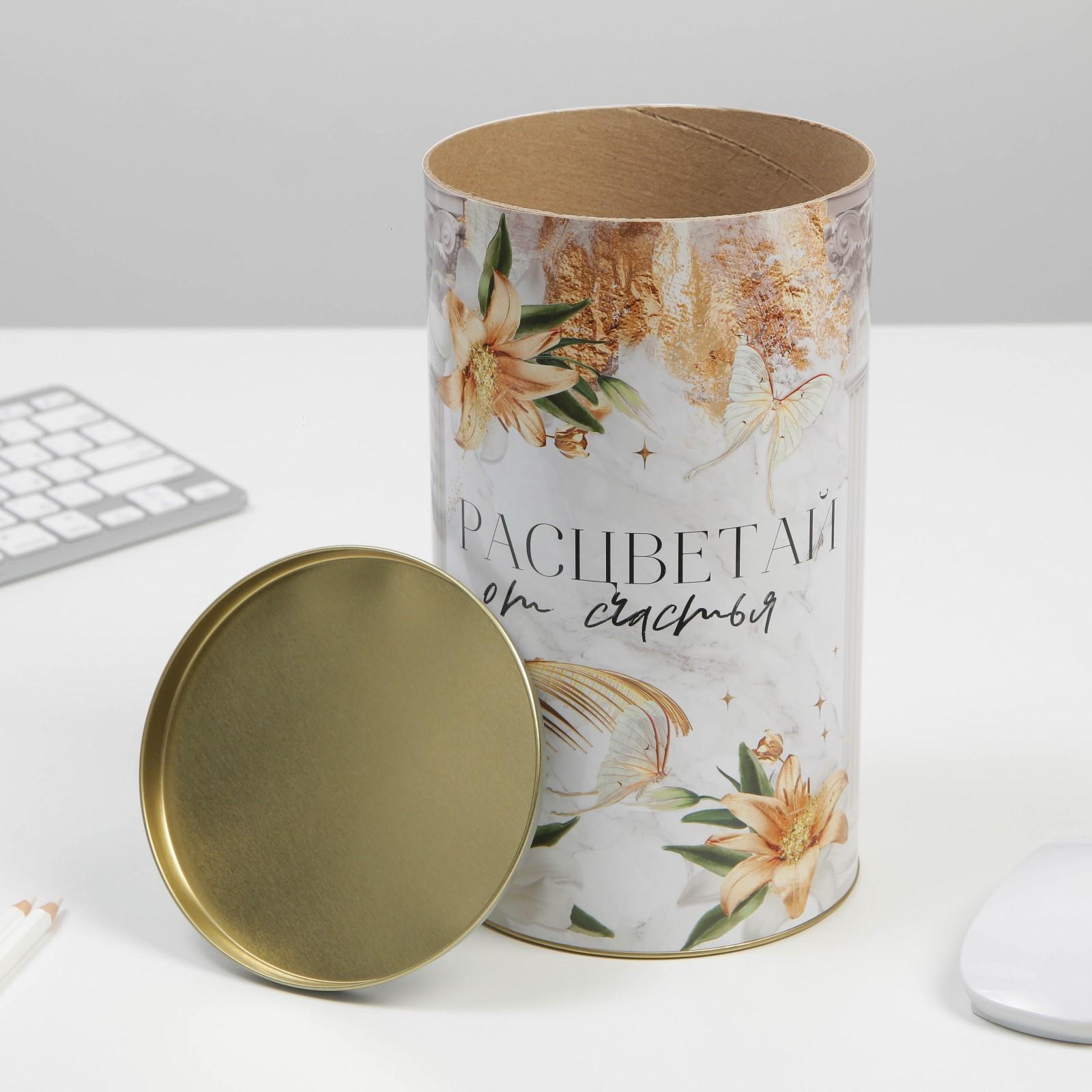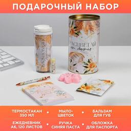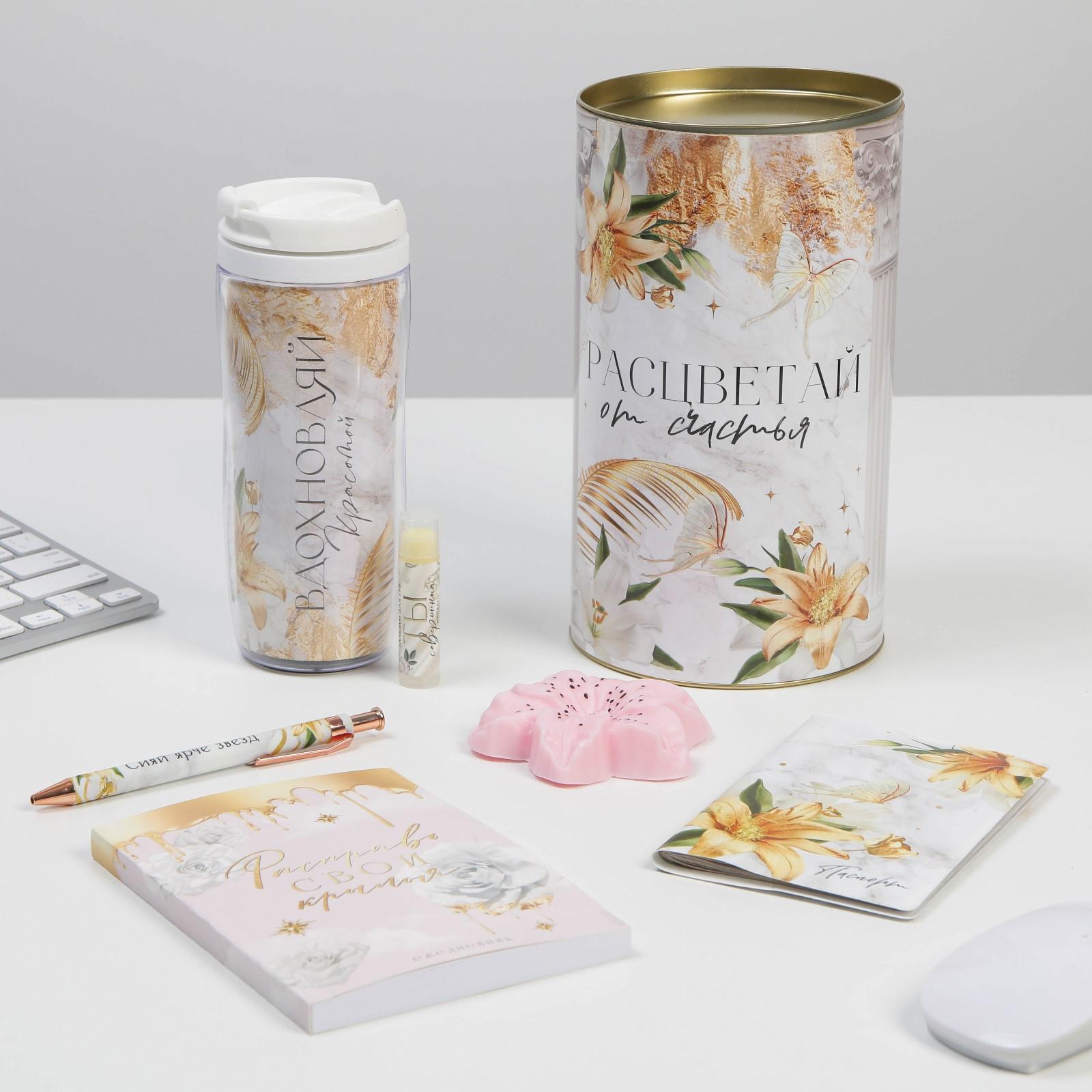 Подарочный набор в тубусе «Расцветай от счастья»: ежедневник, ручка, паспортная обложка, термостакан, мыло-цветок, бальзам для губ