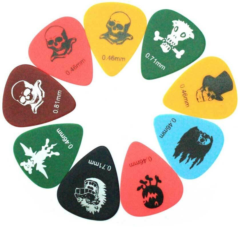 Alice AP-100D 10 Pack набор медиаторов, разной толщины AP-100D матовые медиаторы из целлулоида с изображениями черепов и монстров Медиаторы Alice изготавливаются путем вырубки из листов высококачественного целлулоида. Износостойкие, с гладкими углами, длительный срок службы. 10 целлулоидных медиаторов с изображениями монстров. Толщина 0, 46-0, 81 мм.