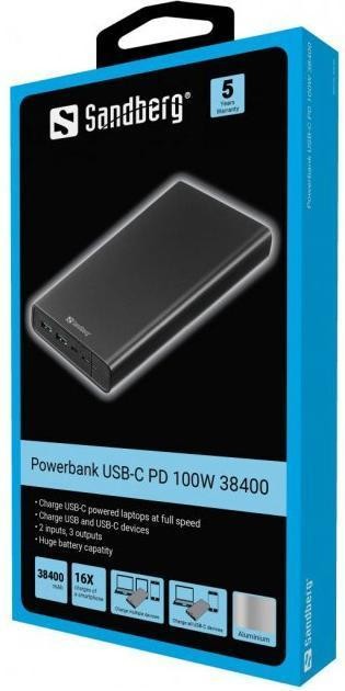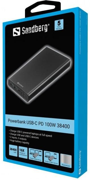Універсальна мобільна батарея Sandberg PD 100W 38400 (420-63) підтримує стандарти USB Type-А та USB Type-C PD 100 Вт. Вона на максимальній швидкості зарядить будь-які ваші мобільні пристрої з роз’ємом USB Type-C. Потужного акумулятора ємністю 38400 мАг вистачає на 16 зарядів смартфона. Ви також зможете продовжити роботу вашого ноутбука, коли це необхідно. Ця портативна батарея підтримує одночасне зарядження декількох пристроїв. Функція power-through дозволяє робити це при зарядженні УМБ. Компактний алюмінієвий корпус та невелика вага батареї роблять її зручною для транспортування. Залишайтесь на зв’язку навіть під час найтривалішої подорожі.