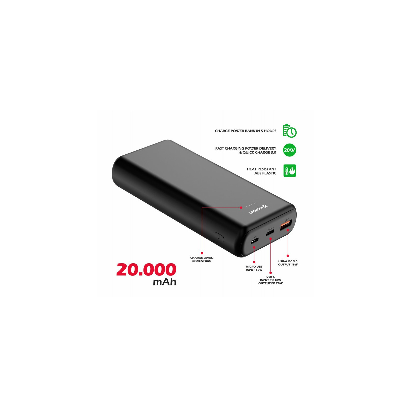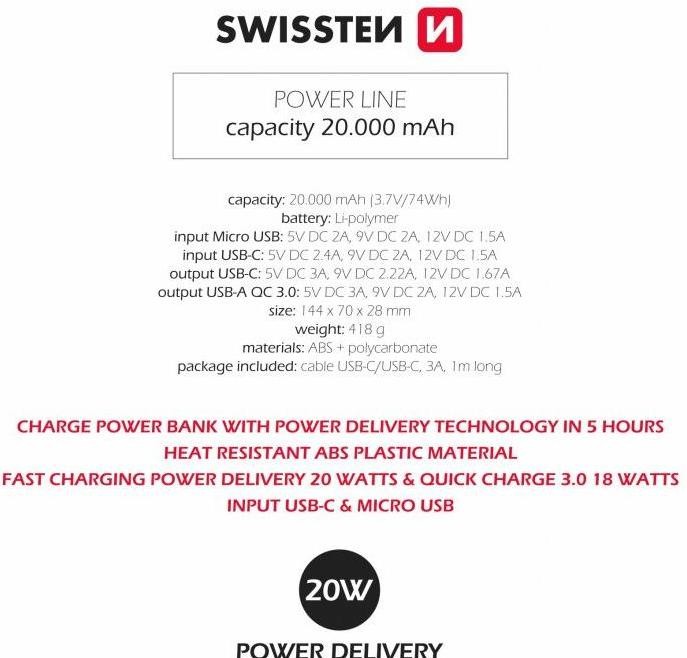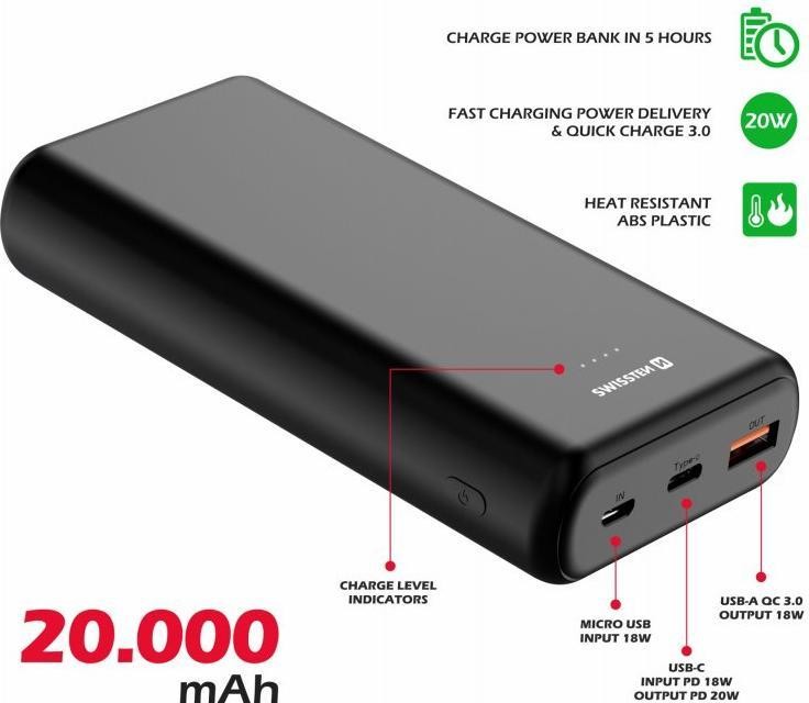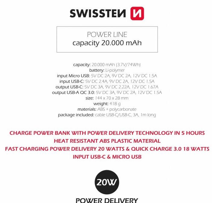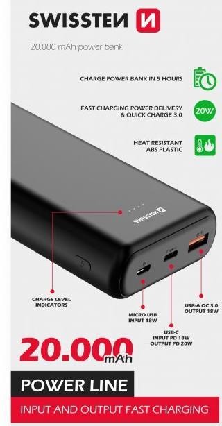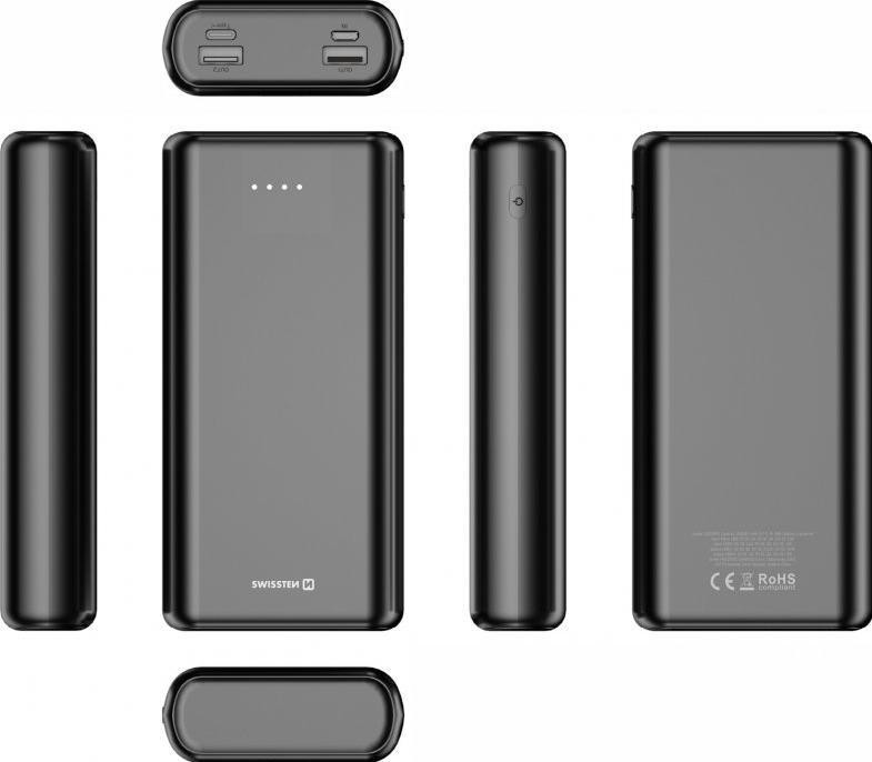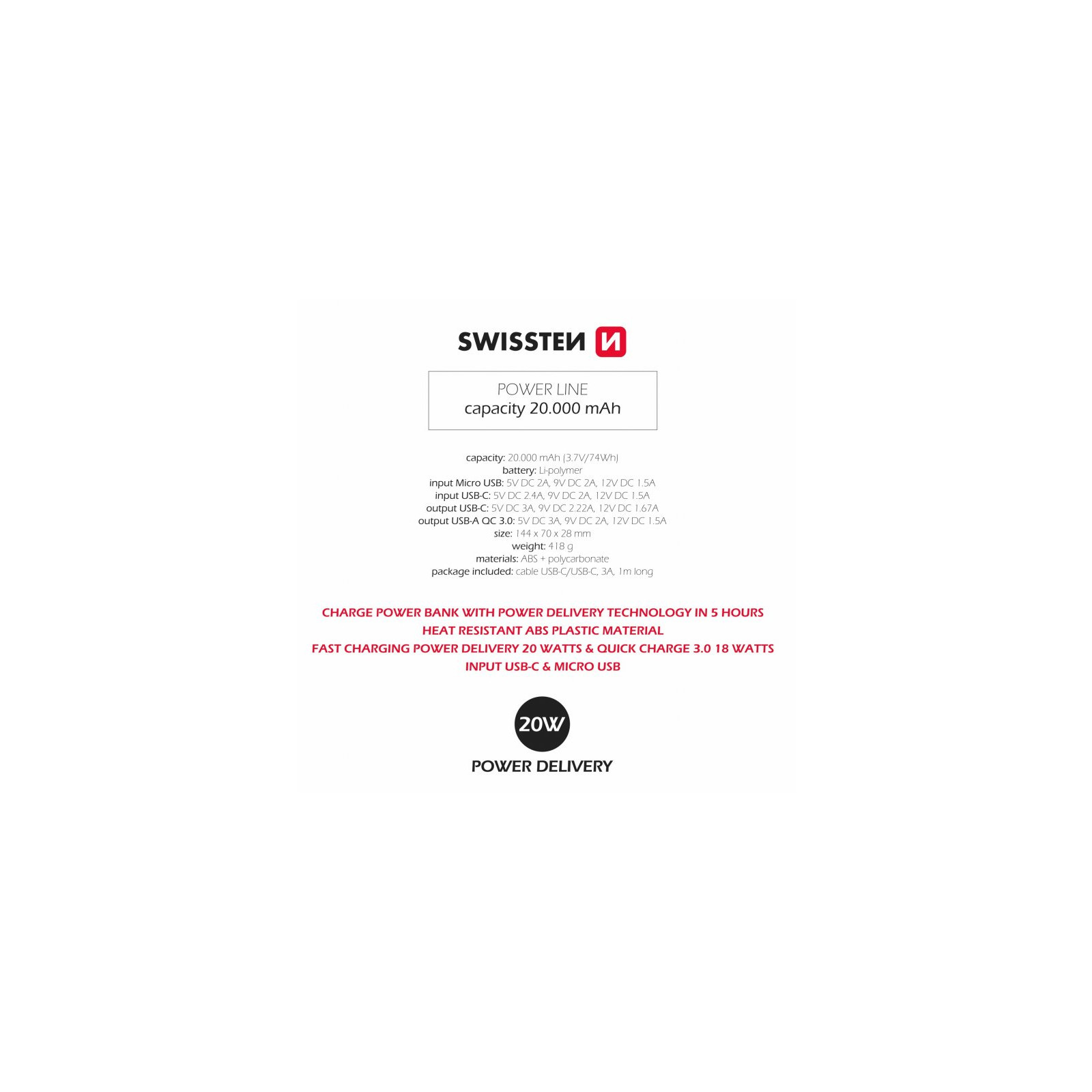 Батарея універсальна SWISSTEN 20000mAh PD/20W, QC/3.0, USB-C, Micro-USB, USB-A, +cable USB-C 3A (1283126559181)