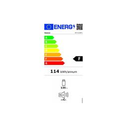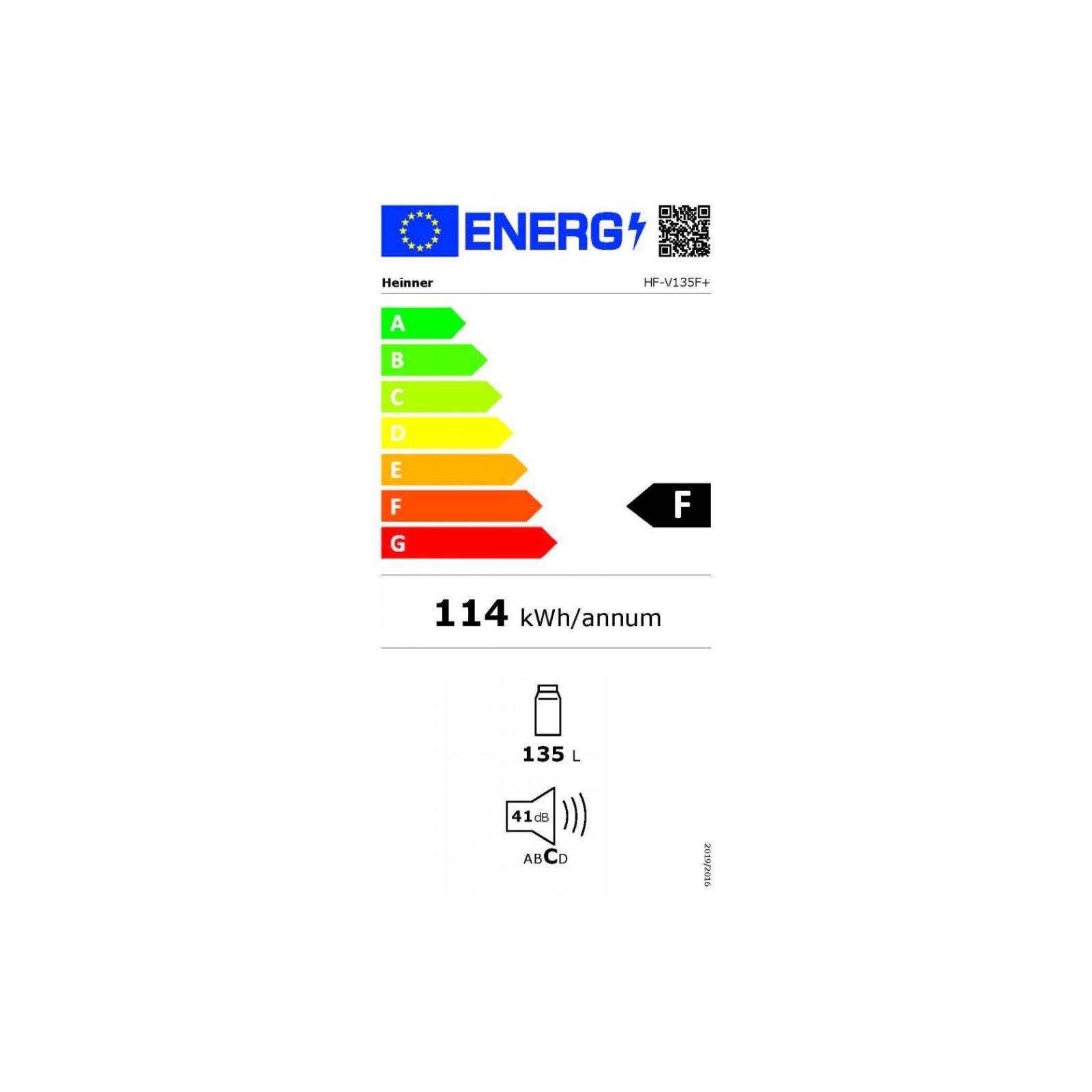 Холодильник Heinner HF-V135F+ , клас енергоефективності F, загальний об'єм: 135 л, механічне управління з регульованим термостатом, світлодіодне підсвічування, автоматичне розморожування, 2 скляні полиці, 1 відділення для фруктів і овочів, лоток для яєць, розміри продукту: 54 x 59,5 х 83,8 см.