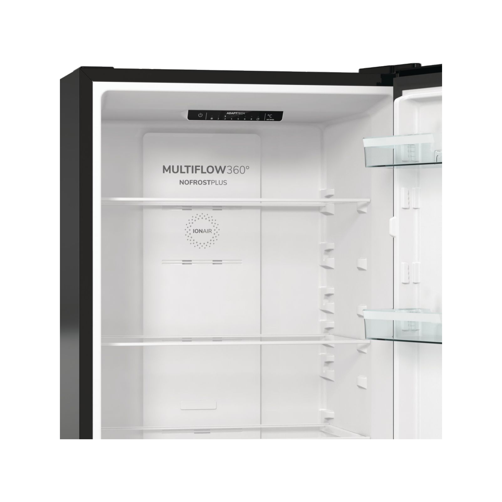 Іонізатор IonAir створює всередині пристрою негативно заряджені іони, які рівномірно розподіляються по всьому холодильному відділенню за допомогою нової системи вентиляції MultiFlow 360°. Повітря, збагачене аніонами, зберігає смак продуктів і видаляє неприємні запахи.