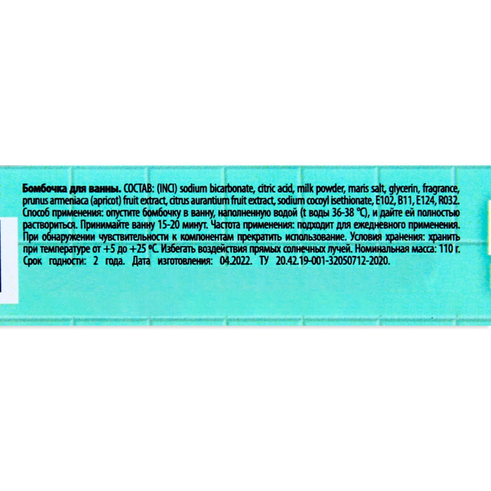 СОСТАВ: (INCI) Sodium Bicarbonate, Citric Acid, Milk Powder, Maris Salt, Glycerin, Fragrance, Prunus Armeniaca (Apricot) Fruit Extract, Citrus Aurantium Fruit Extract, Sodium Cocoyl Isethionate, Е102, В11, Е124, R032.