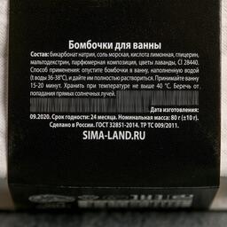 Состав: бикарбонат натрия, соль морская, кислота лимонная, глицерин, мальтодекстрин, парфюмерная композиция, цветы лаванды, Сl 28440.