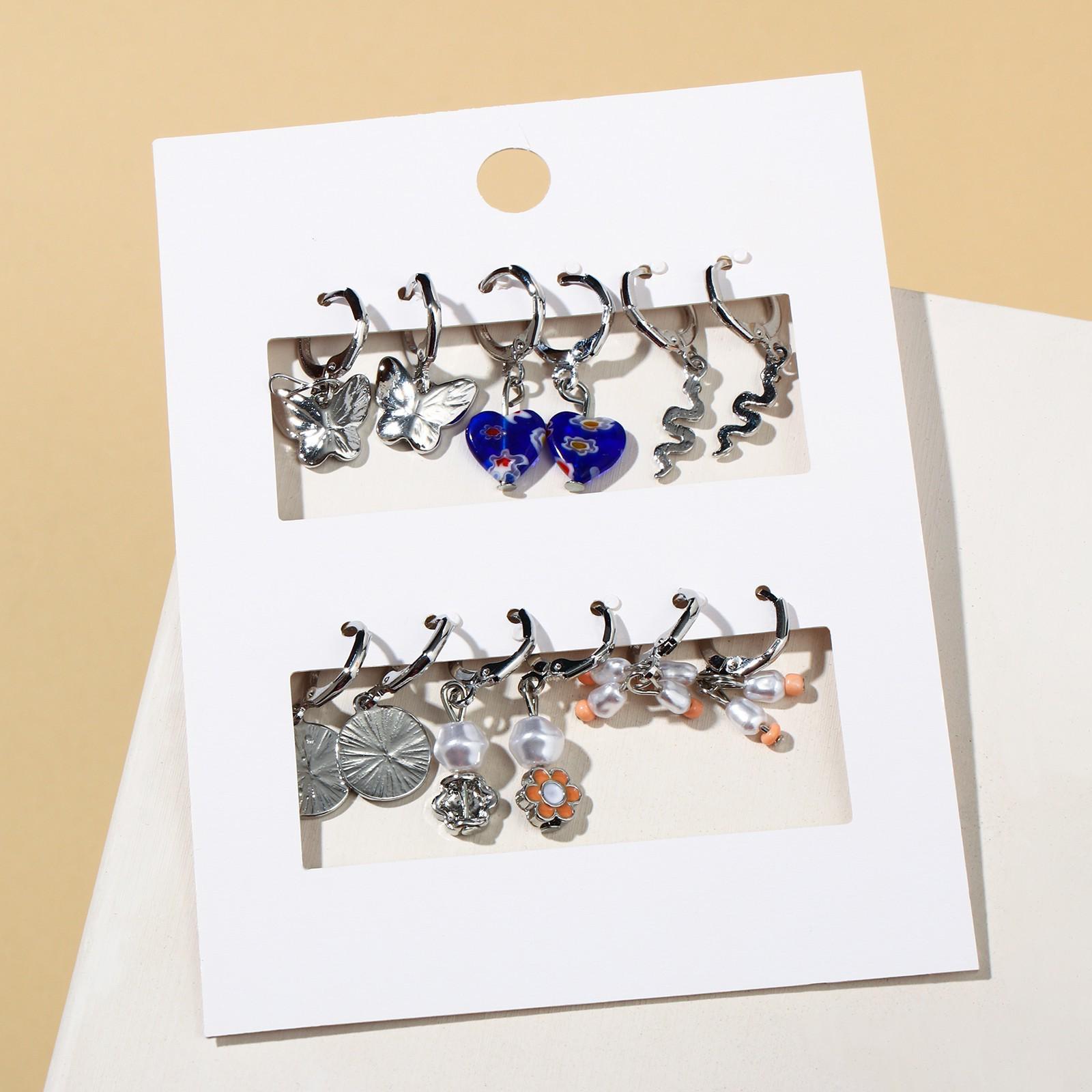 Набор серьги 6 пар "Цацки" змеи, бабочки, око, цветные в серебре