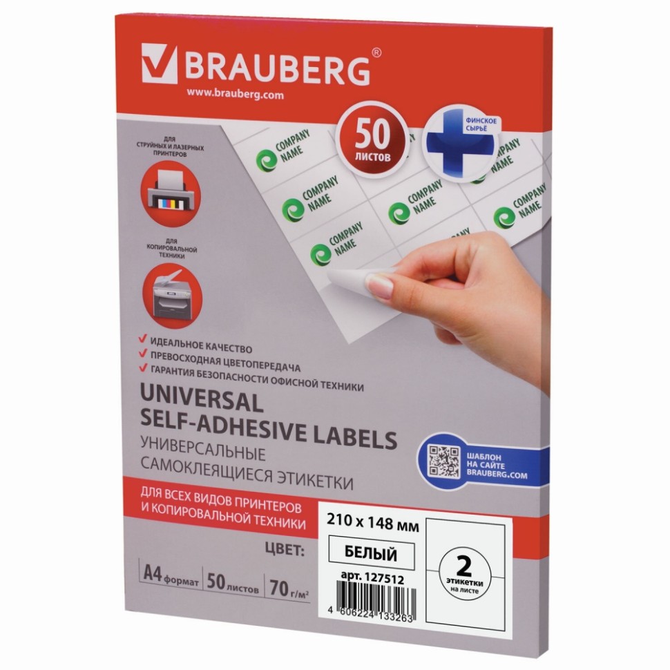 Самоклеящиеся этикетки позволят быстро и качественно подготовить адресные наклейки, регистрационные номера, аннотации при помощи лазерного или струйного принтера. Совместимы со всеми видами офисной техники. Назначение: универсальное. Количество этикеток на листе: 2 шт.. Длина этикетки: 210 мм. Ширина этикетки: 148 мм. Форма: прямоугольная. Количество листов в упаковке: 50 шт.. Технология печати: для лазерной печати, для струйной печати. Плотность: 70 г/м2. Тип поверхности: матовая. Цвет этикетки: белый. Спецэффект цвета: нет. Шаблон для скачивания: да Бренд - BRAUBERG. Производитель - Россия. Артикул - 127512. Штрихкод - 4606224133263