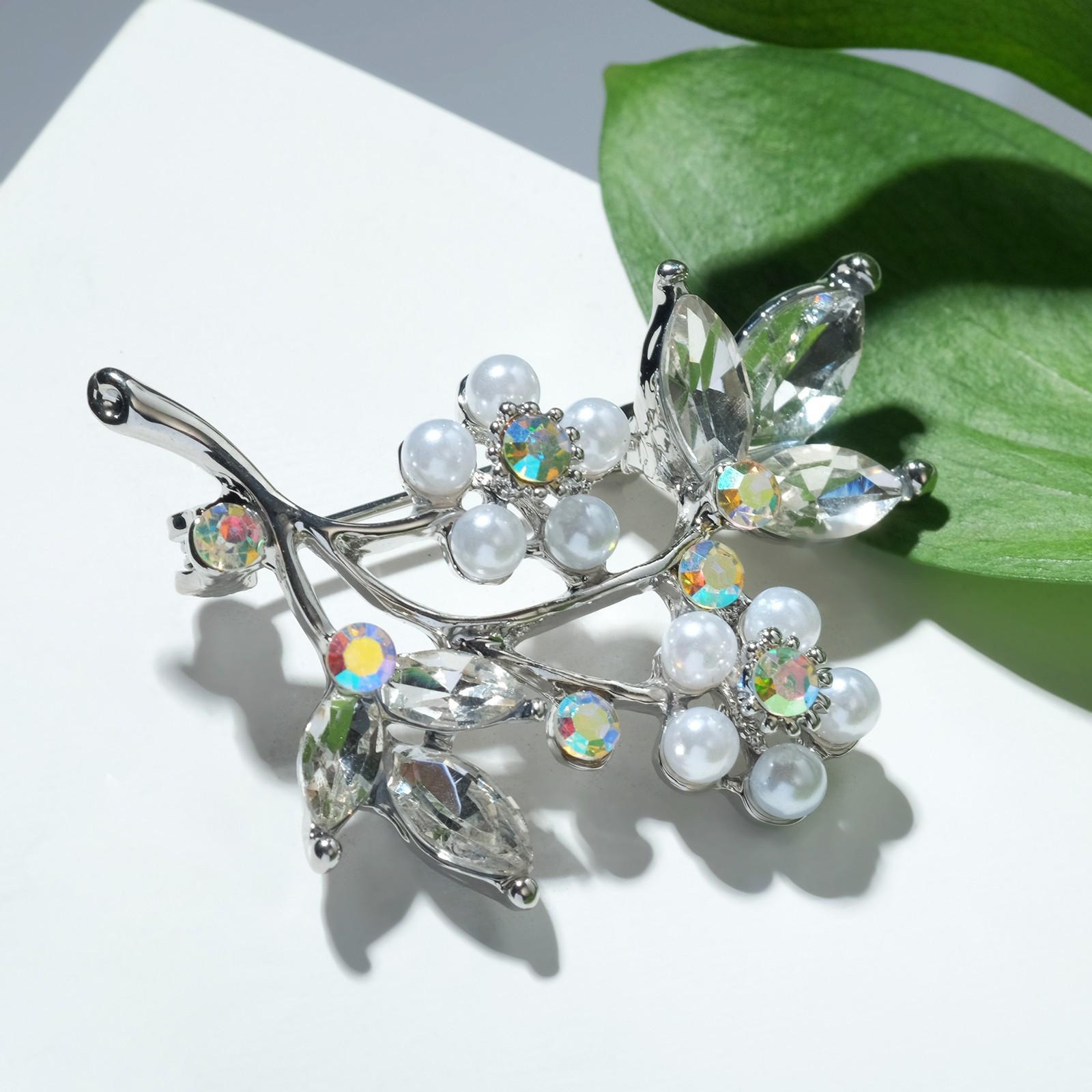 Брошь "Жемчужные цветы" со стеклянными листами, цвет белый в серебре