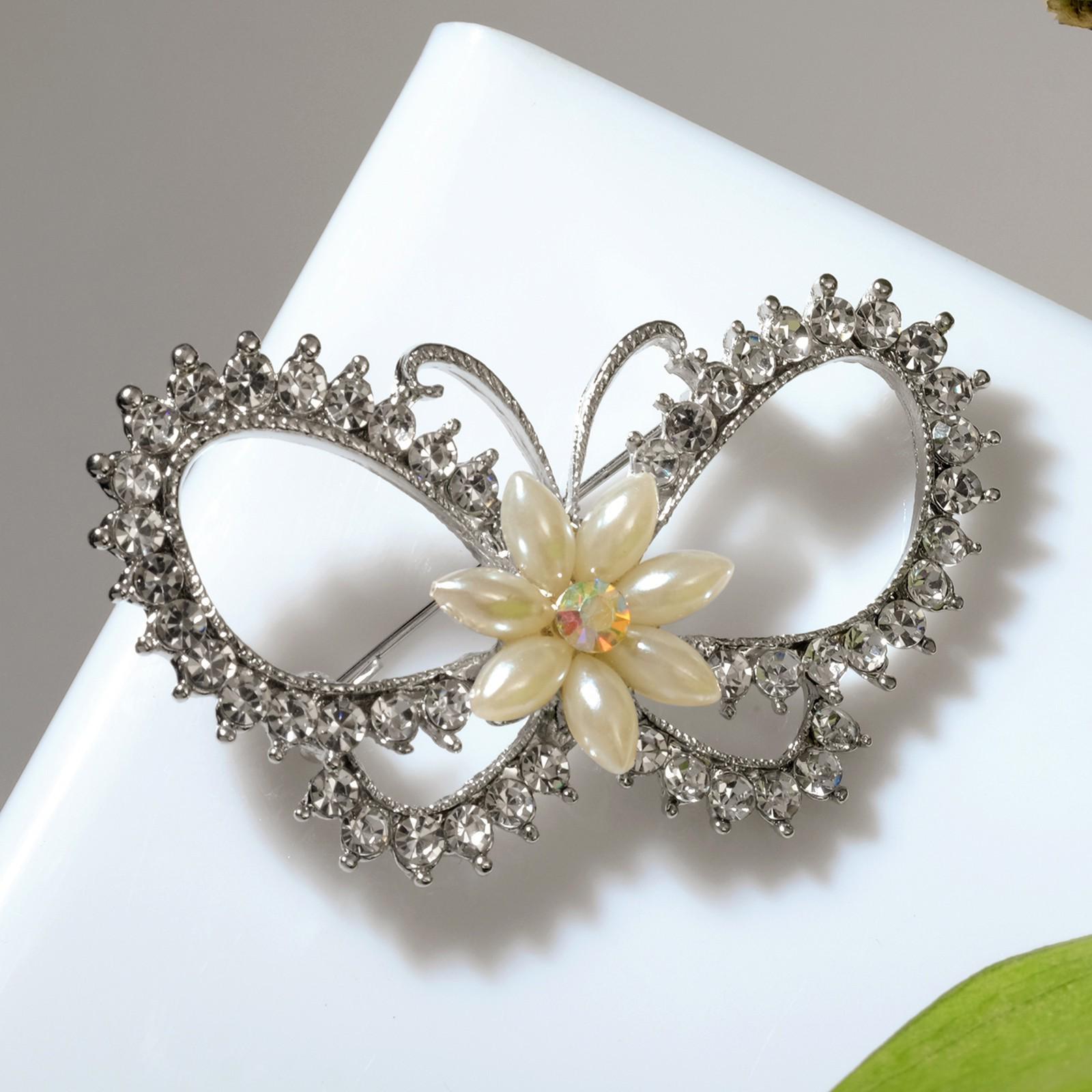 Брошь "Цветочная бабочка", цвет белый в серебре