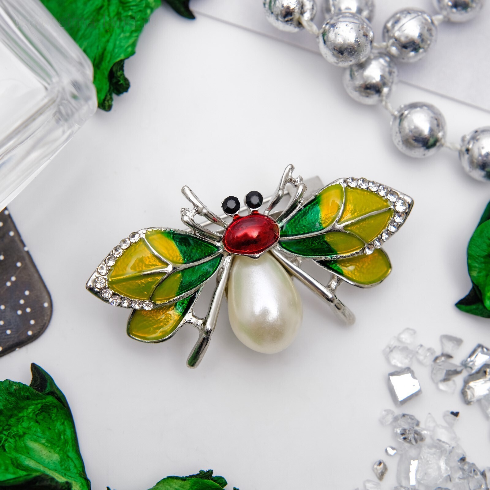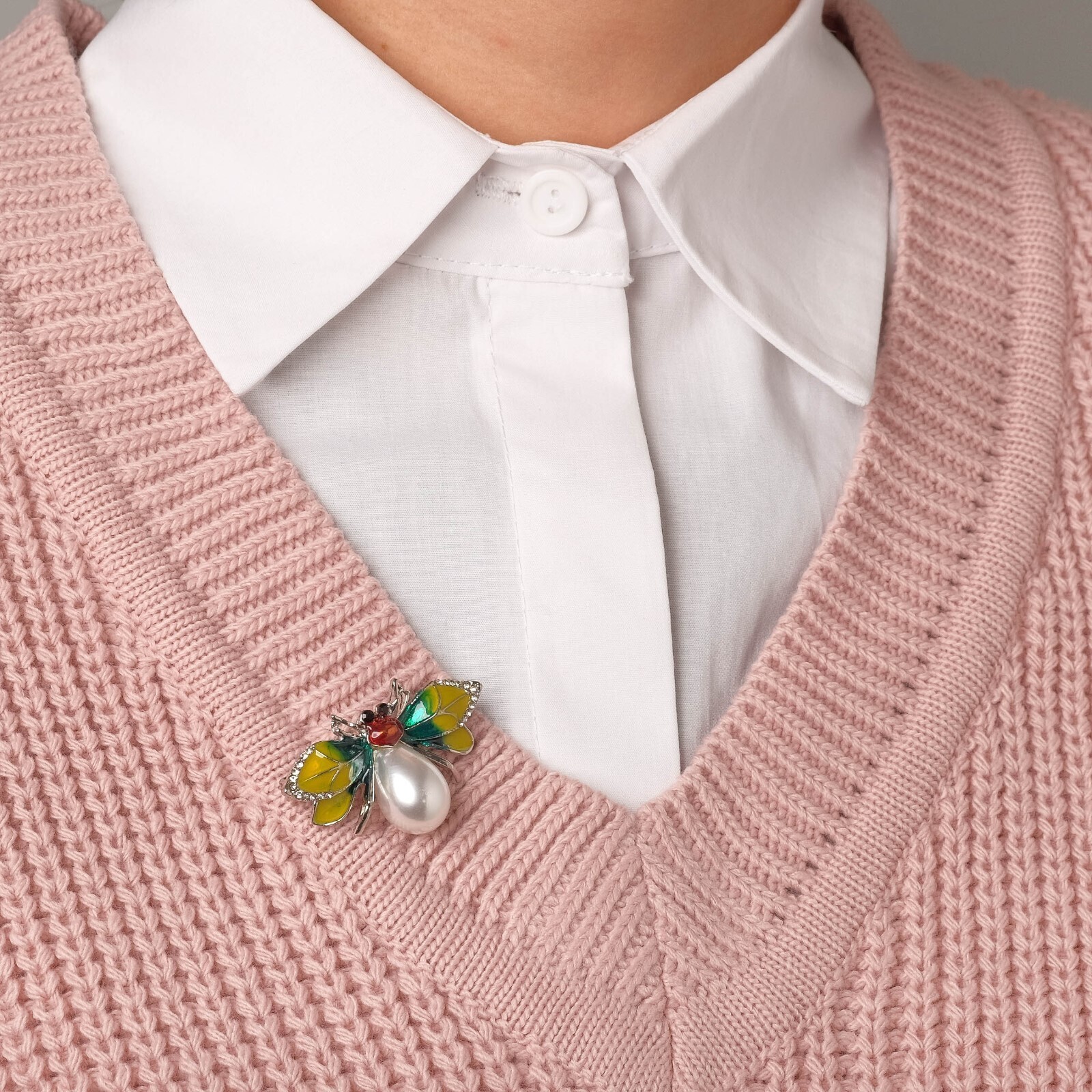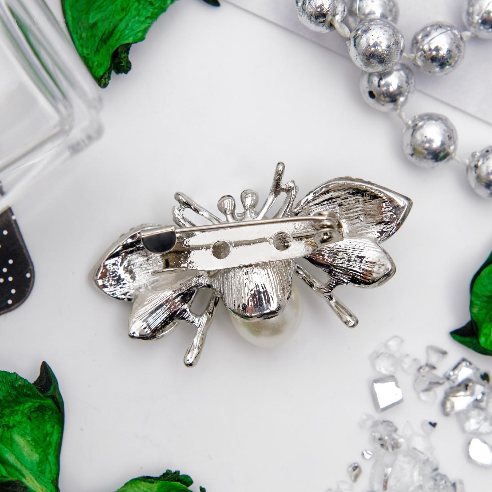 Брошь "Муха" с жемчужным брюшком, цвет бело-зеленый в серебре
