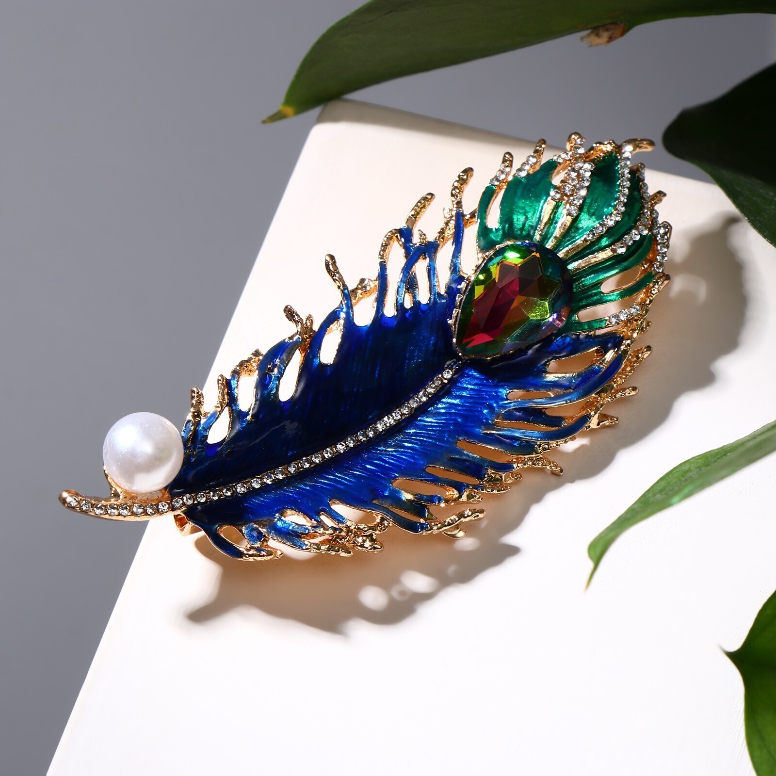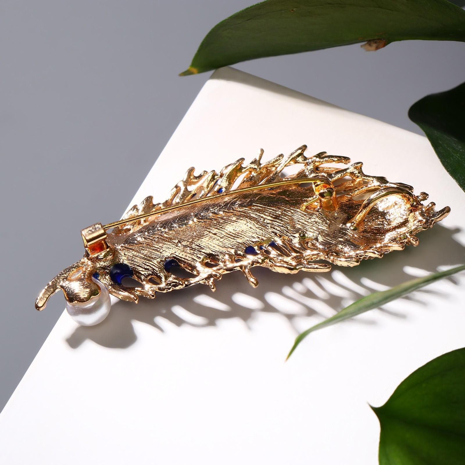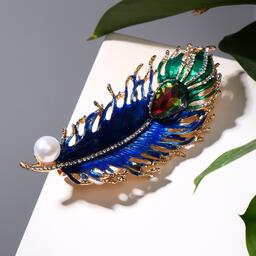 Брошь "Перо павлина" пушистое, цветная в золоте