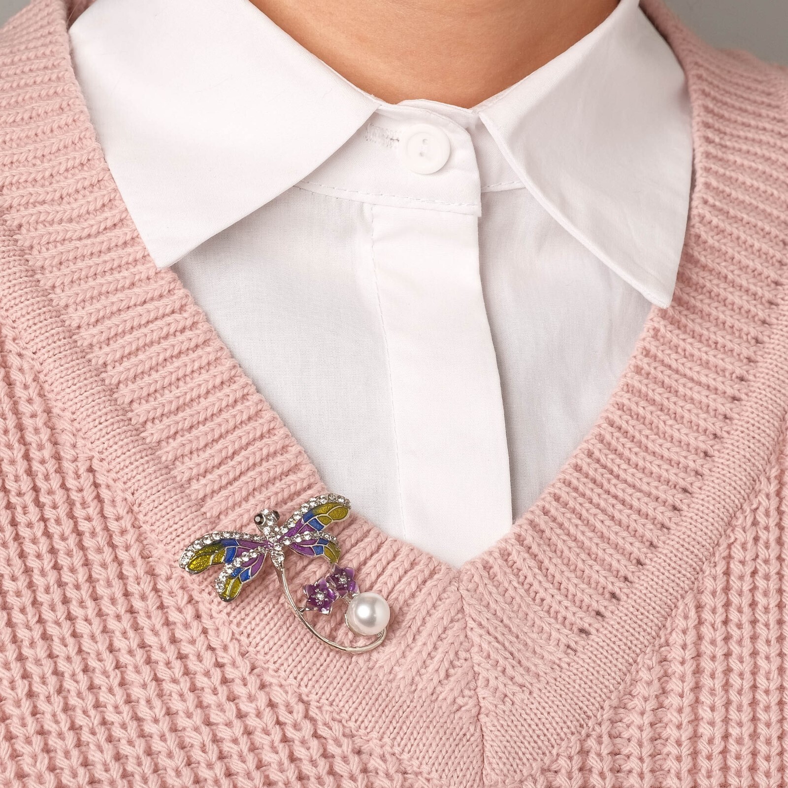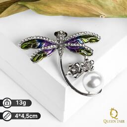 Брошь "Стрекоза" с бусиной, цветная в серебре