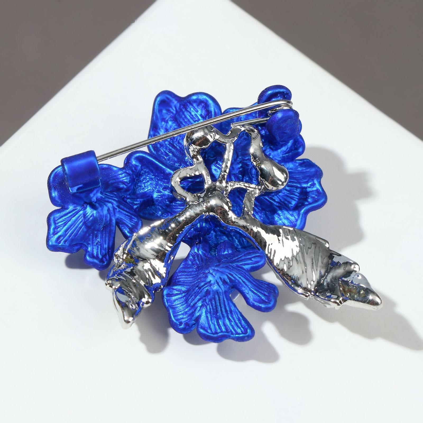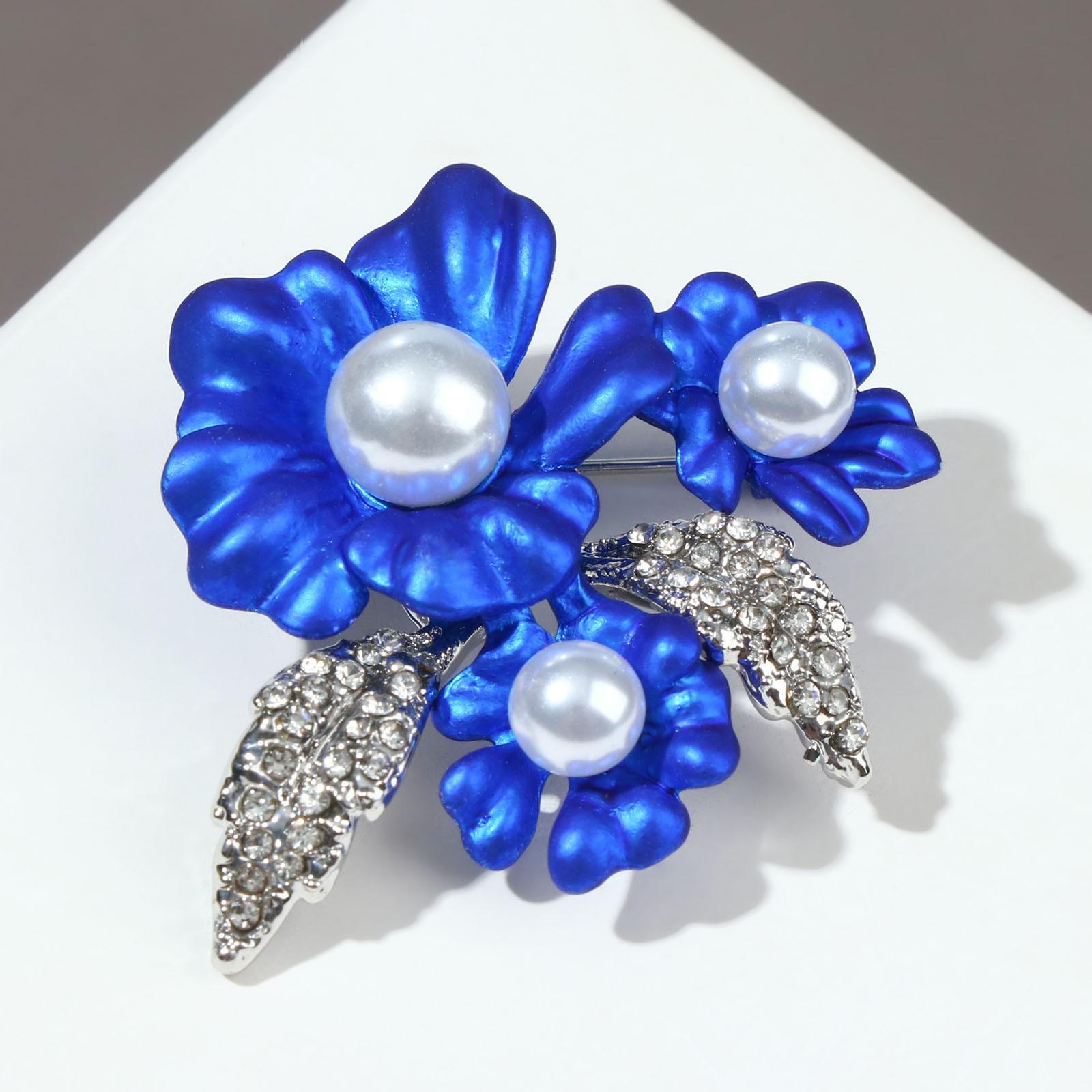 Брошь "Цветы" матовые с бусинами, цвет бело-синий в серебре