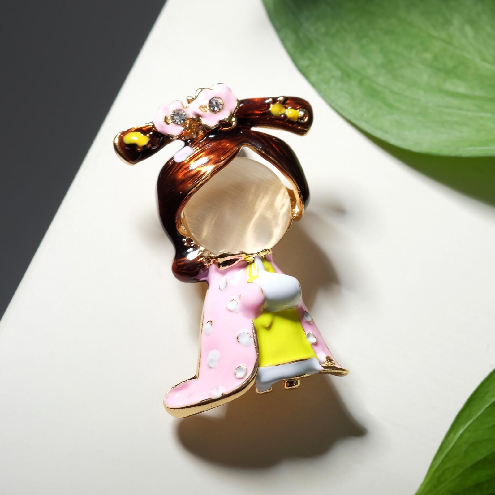 Брошь "Девушка Гейша" с цветами, цветная в золоте