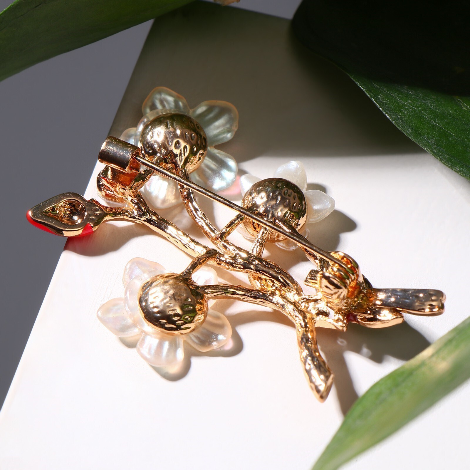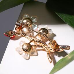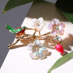 Брошь барокко "Птица" на цветущей ветке, цветная в золоте