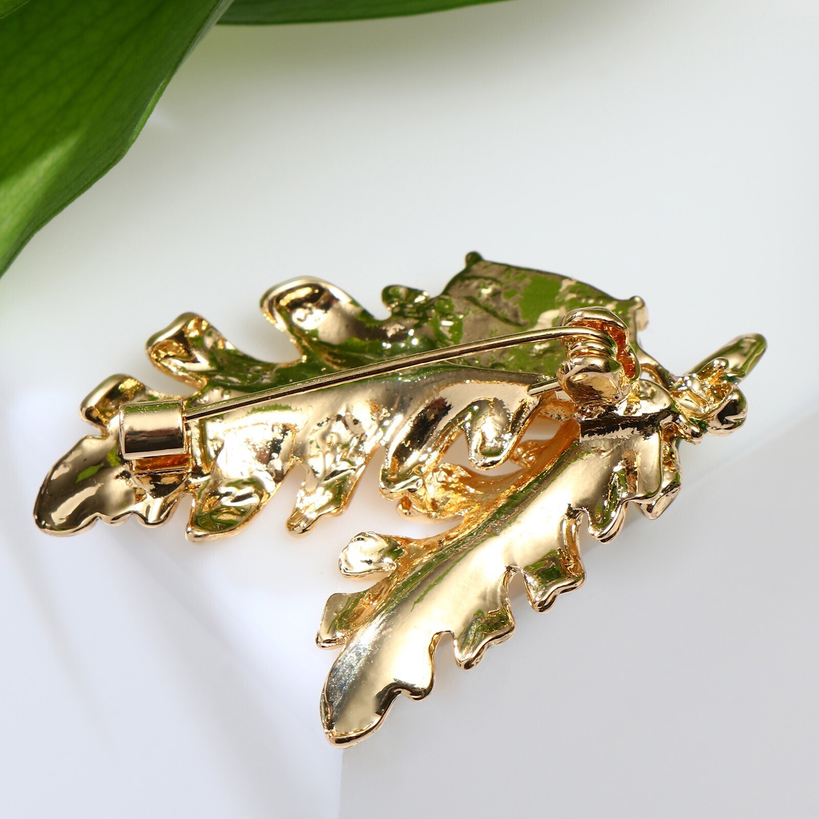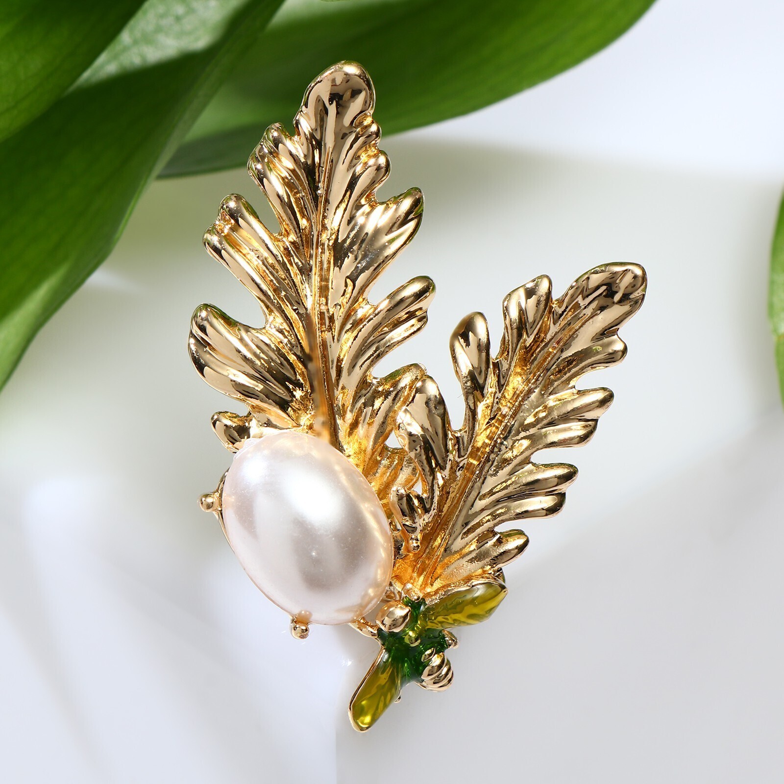 Брошь "Листья" с мотыльком, цвет бело-зелёный в золоте
