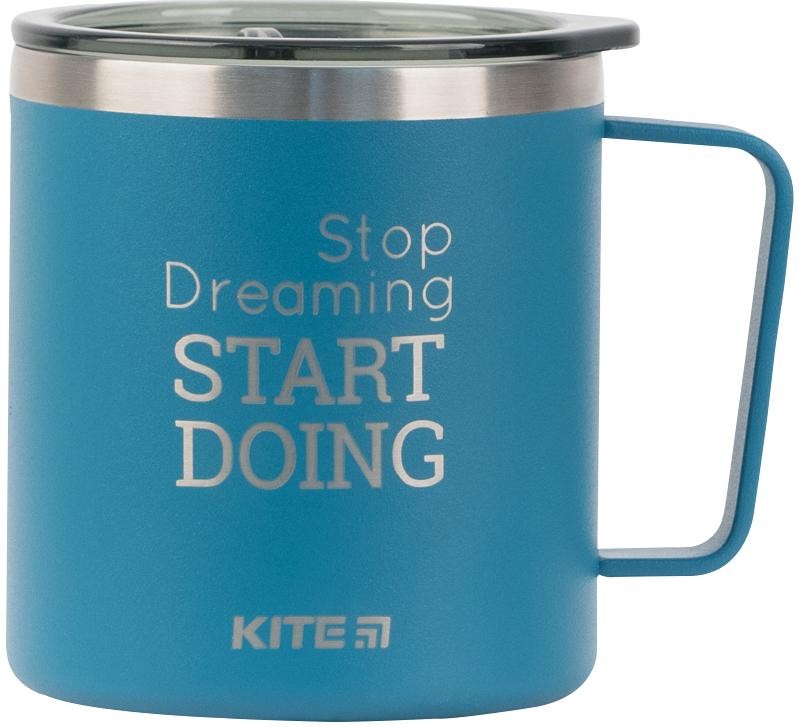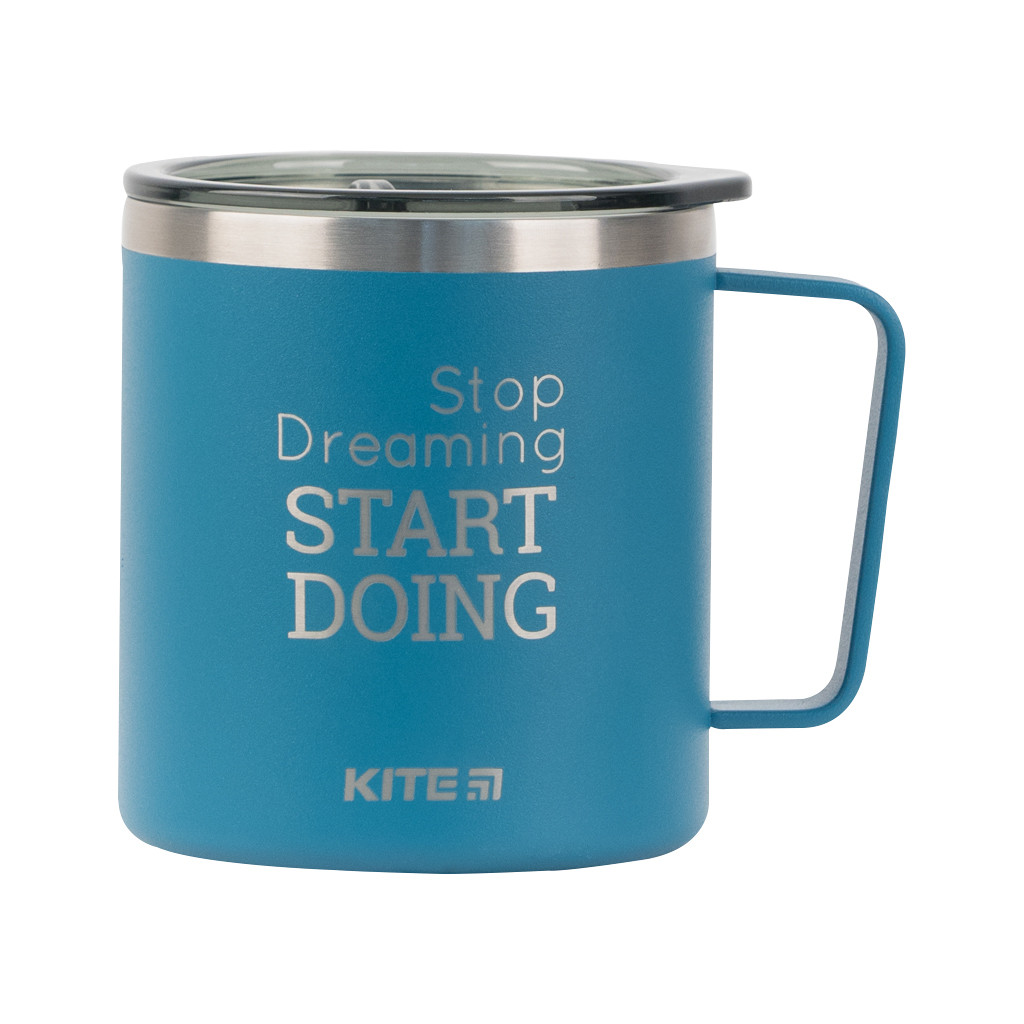Стильний дизайн порадує справжніх естетів досконалістю форм і текстур. Однотонне матове покриття доповнено лаконічним декором: кожну чашку прикрашає мотивуючий напис, нанесений методом гравіювання. Прозора кришка не дасть напою остигнути або розплескатися.