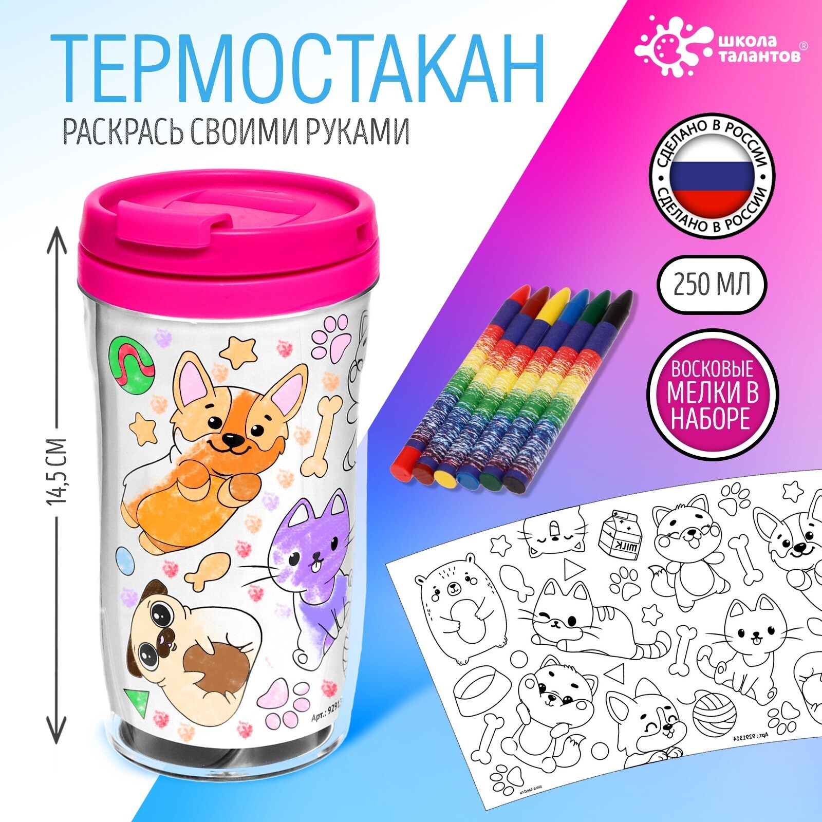 Термостакан-раскраска — это практичный аксессуар, который ребёнок раскрасит на свой вкус. С таким термостаканом ребёнок сможет наслаждаться любимым напитком на прогулке или по дороге в детский сад или школу.