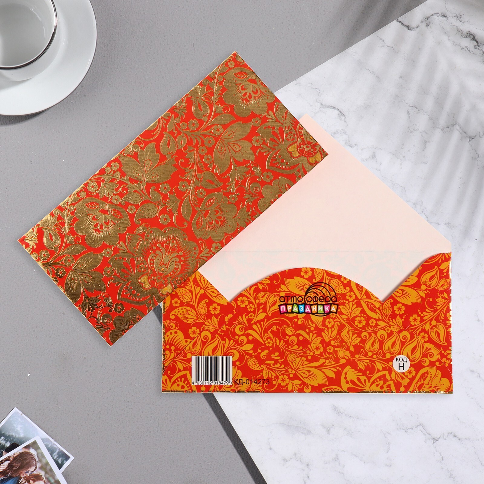 Конверт для денег "Универсальный" тиснение, узоры, красный фон