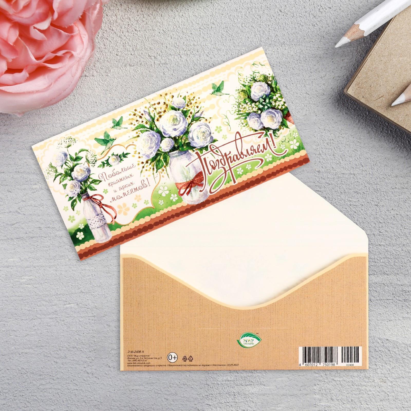 Конверт для денег "Поздравляем!" цветы, ваза, 17х8,3 см