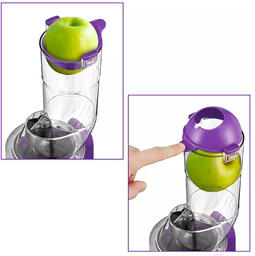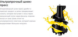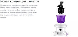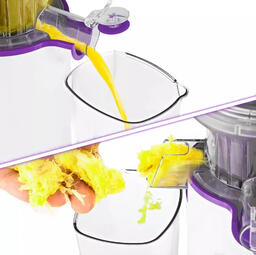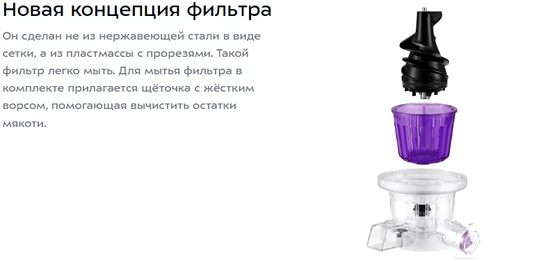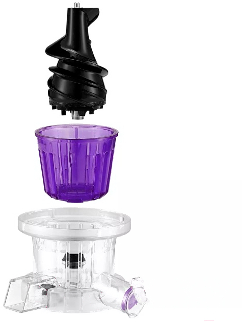 • В комплекте щеточка для чистки, толкатель, крышка, отдельная чаша для жмыха (0.65 л), шнек, насадка для отжима в стакан, емкость для сока, фильтр