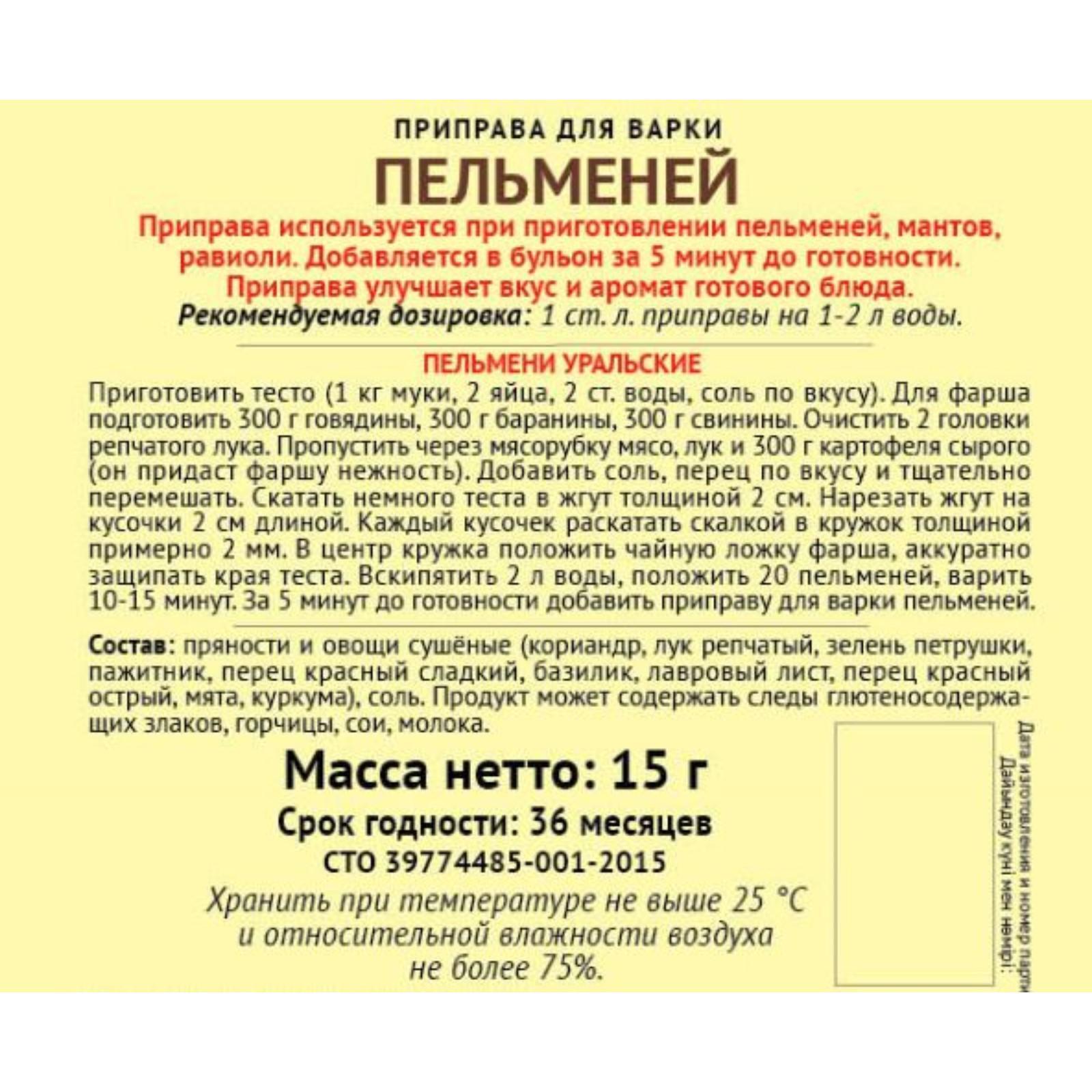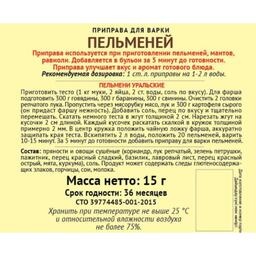Назначение: приправа используется для приготовления пельменей, мантов, равиоли. Добавляется в бульон за 5 минут до готовности. Приправа улучшает вкус и аромат готового блюда.