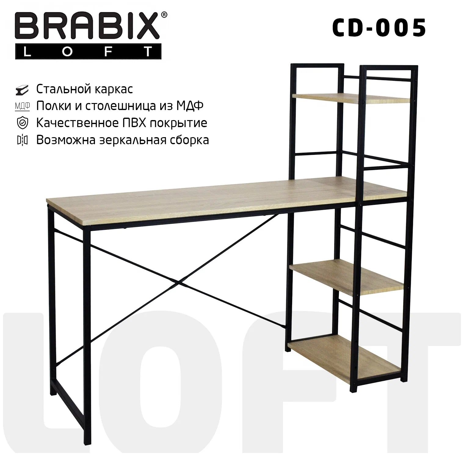 Полнофункциональный стол BRABIX LOFT CD-005 - это сочетание письменного стола и стеллажа. Высококачественные материалы, стильный дизайн и продуманная эргономика - традиционный подход к мебели BRABIX. Материал столешницы - МДФ с устойчивым к повреждениям и влаге ПВХ-покрытием. Опоры стола выполнены из металла с ", матовым", покрытием и сечением 20х20 мм - надежная, безопасная и долговечная конструкция. Ножки стола оснащены пластиковыми накладками, которые защищают пол от повреждений. Функциональность стола обеспечивается тремя дополнительными полками, где можно хранить необходимые для вашей работы вещи: от канцелярских принадлежностей и книг до ноутбука. Оптимальные габариты BRABIX LOFT CD-005 подходят даже для небольших помещений. Лёгкая сборка, функциональность, лаконичный, современный дизайн и компактный размер по разумной цене - это безусловные преимущества стола BRABIX LOFT CD-005.