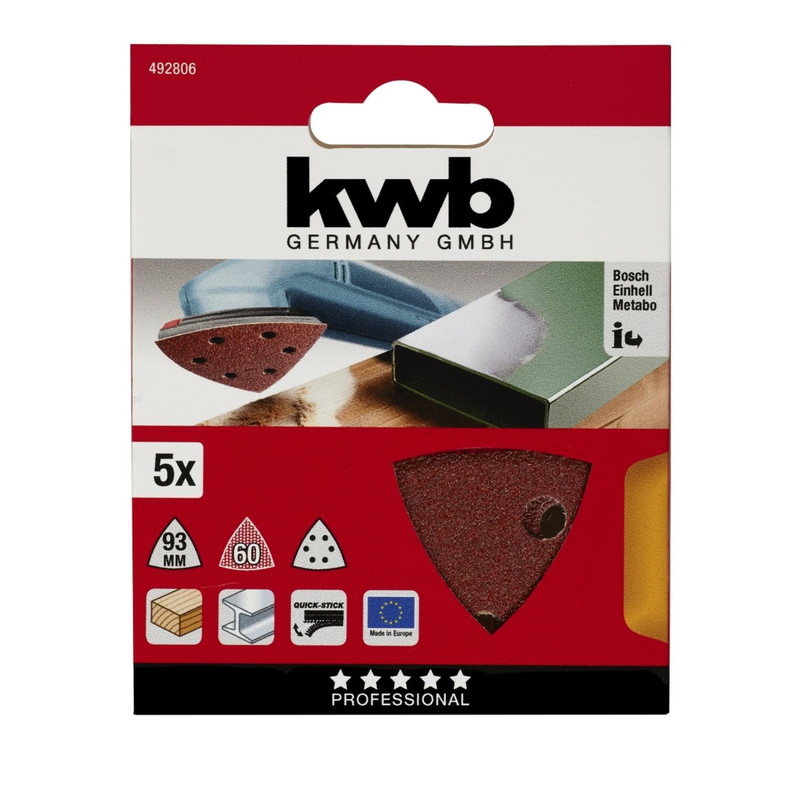 Треугольник шлифовальный KWB DELTA, 93х93х93 мм, К60, оксид алюминия, липучка, 5 шт