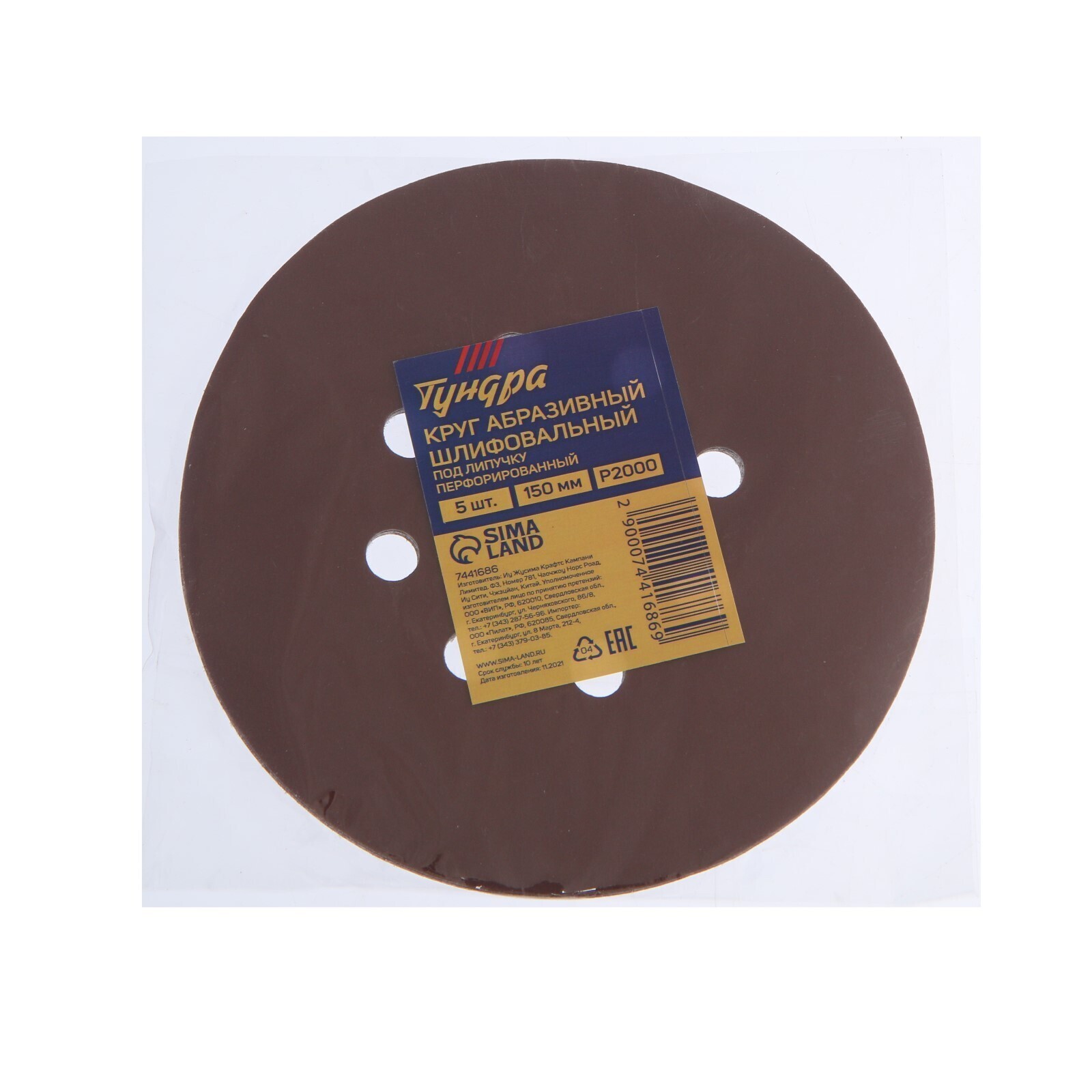 Круг абразивный шлифовальный под "липучку" ТУНДРА, перфорированный, 150 мм, Р2000, 5 шт.