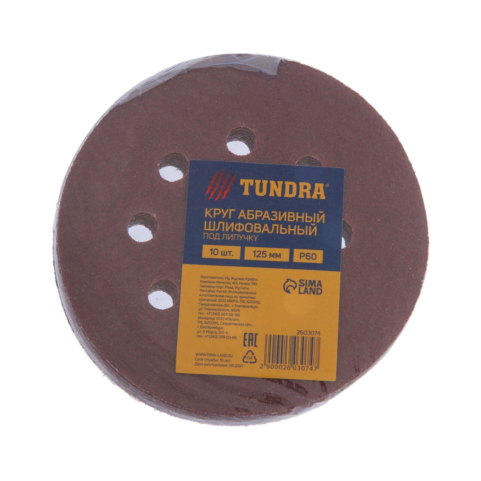 Круг абразивный шлифовальный под "липучку" ТУНДРА, перфорированный, 125 мм, Р60, 10 шт.