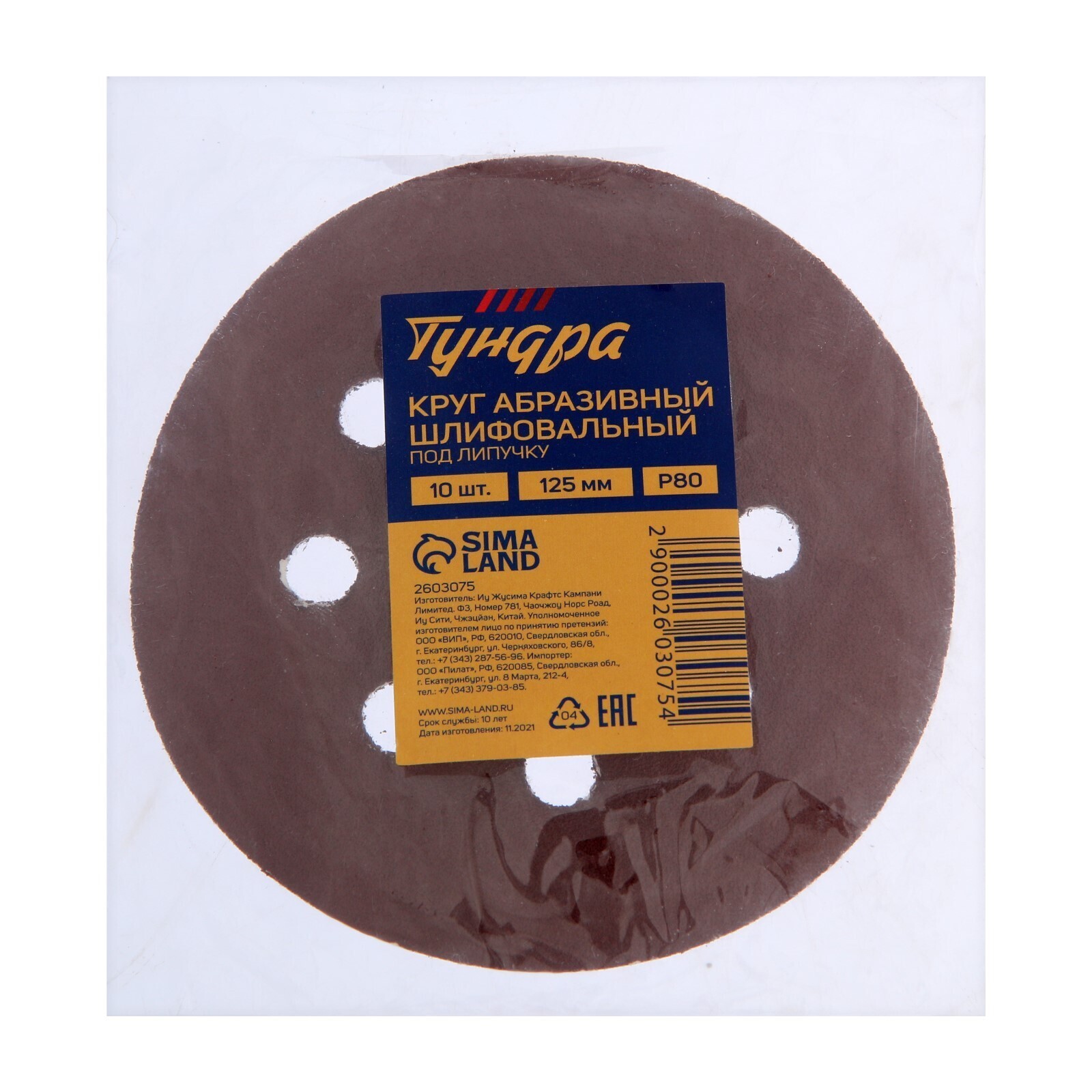 Круг абразивный шлифовальный под "липучку" ТУНДРА, перфорированный, 125 мм, Р80, 10 шт.