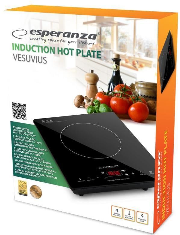 Індукційна плита Esperanza EKH009 чудово підходить для економії енергії та часу приготування. Вона нагріває тільки основу кухонного начиння і лише область, де вона використовується. Завдяки спеціально розробленим функціям ви можете вибрати процес приготування та температуру, натиснувши лише одну кнопку.