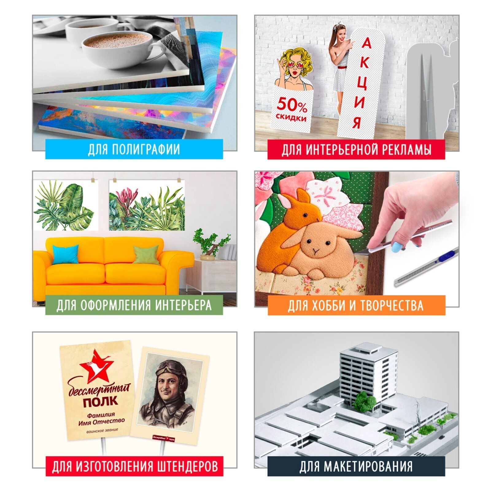 Пенокартон за счет своего легкого веса и при этом высокой прочности может использоваться в качестве рекламного материала для создания настенных планшетов, досок объявлений, информационных табличек, вывесок, постеров, витринных декораций и ростовых фигур.