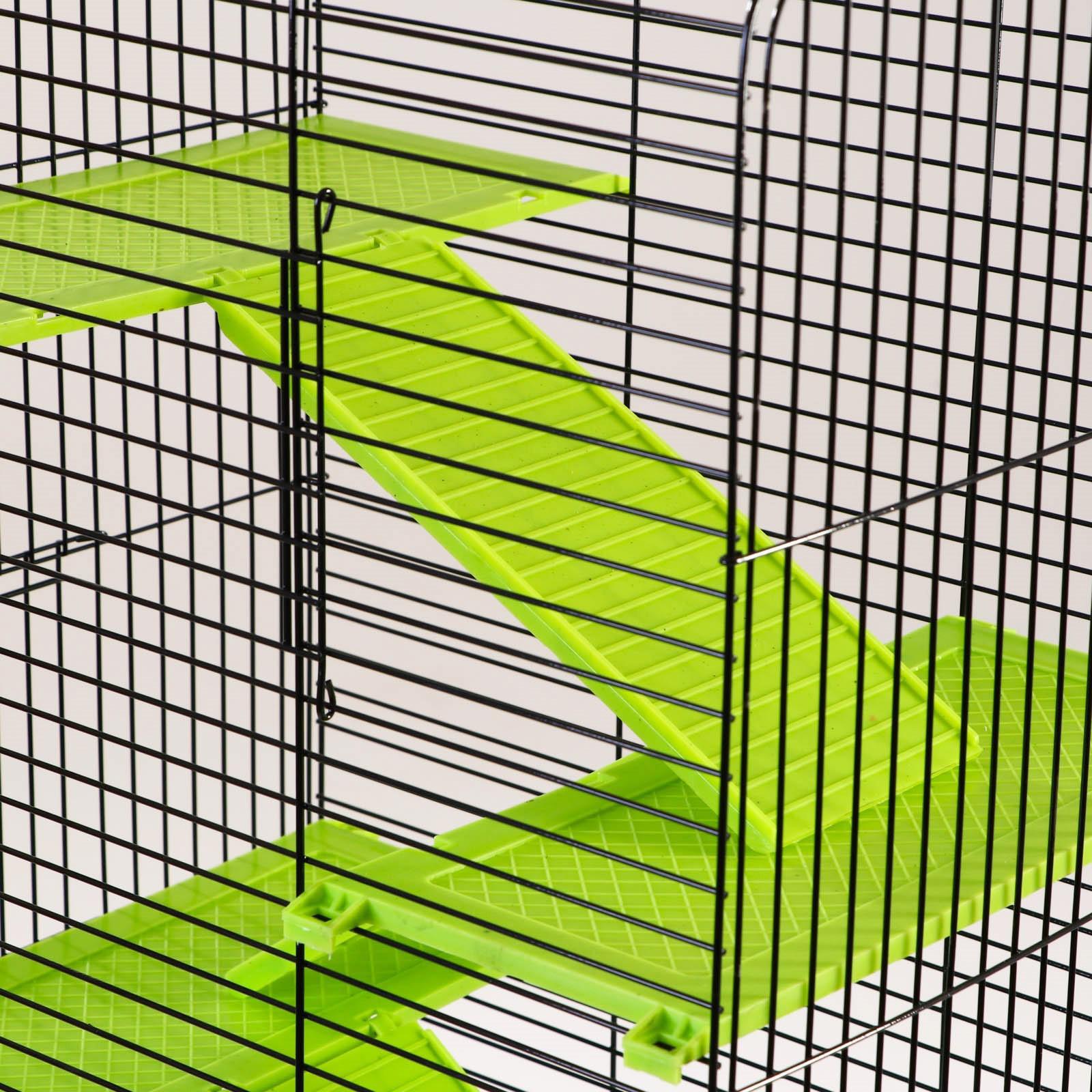 Клетка-вольер для животных (хорьков, белок, шиншилл, крупных дегу, крыс) с выдвижным пластиковым поддоном с высокими бортиками, который максимально упрощает процесс уборки. На фасаде клетки имеются две большие удобные дверцы с надежными запирающими механизмами.