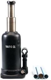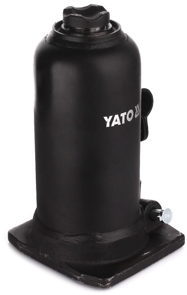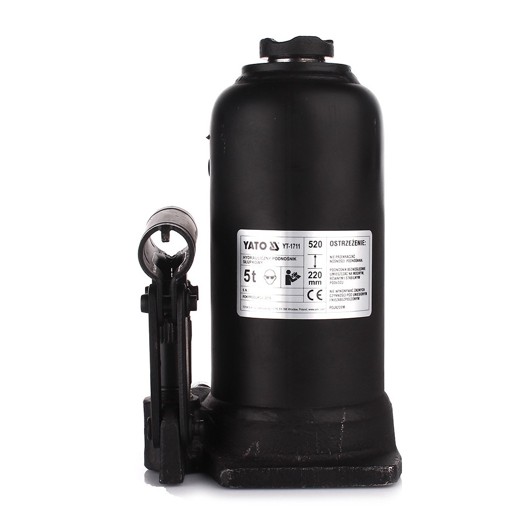 YATO YT-17001 - Домкрат гідравлічний двухштоковий, універсальний вантажопідйомний механізм. Призначений для підйому, утримання і фіксації автомобіля, в процесі проведення ремонтних і діагностичних робіт. Модель YT-1711 пляшкового типу, має максимальну вантажопідйомність 5 тон, що цілком достатньо для вантажного автомобіля чи автобуса. Перевагою даного домкрата є хороша висота підйому 500 мм і висота підхоплення 220 мм, що дозволяє розширити область застосування і ефективно виконувати ремонтні роботи. Подовжена металева приводна ручка, складаний конструкції, передає посилення на нагнітає насос, де нагнітається робоча рідина, яка забезпечує плавний хід при здійсненні підйому і опускання вантажу. Конструкція домкрата представлена в формі пляшки, корпус якого виконаний з міцного металу. Поверхня корпусу покрита спеціальним лакофарбовим покриттям, для запобігання процесу корозії металу і забезпечує тривалий термін служби пристрою. Завдяки широкій опорній поверхні, домкрат досить стійкий і захищений від бокового ковзання.