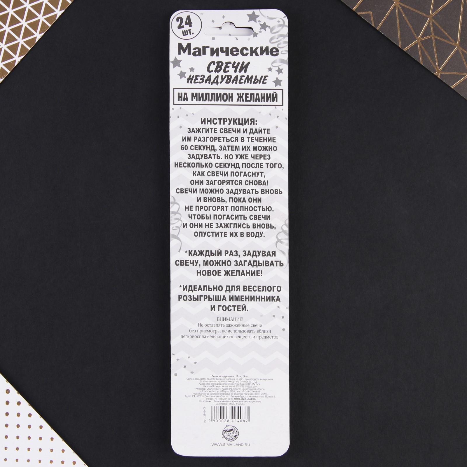 Свечи для торта - это неотъемлемый атрибут праздника. Набор свечей станет прекрасным украшением торта и других кондитерских изделий по случаю дня рождения, юбилея и любого другого торжества. Украсьте угощение стильными свечами, чтобы сделать особенный день ещё более ярким и незабываемым. Для того, чтобы свечи не задувались, им нужно дать 60 секунд разгореться, после чего их можно будет задувать, но уже через несколько секунд, как они погаснут, свечи загорятся снова. Для того,чтобы свечи все-таки потушить, их рекомендуется примочить водой или придавить фитиль свечи. Изготовлены из высокоочищенного пищевого парафина, который не влияет на вкусовые качества блюд, а удобная упаковка помогает сохранять свечи при длительном хранении и транспортировке.
