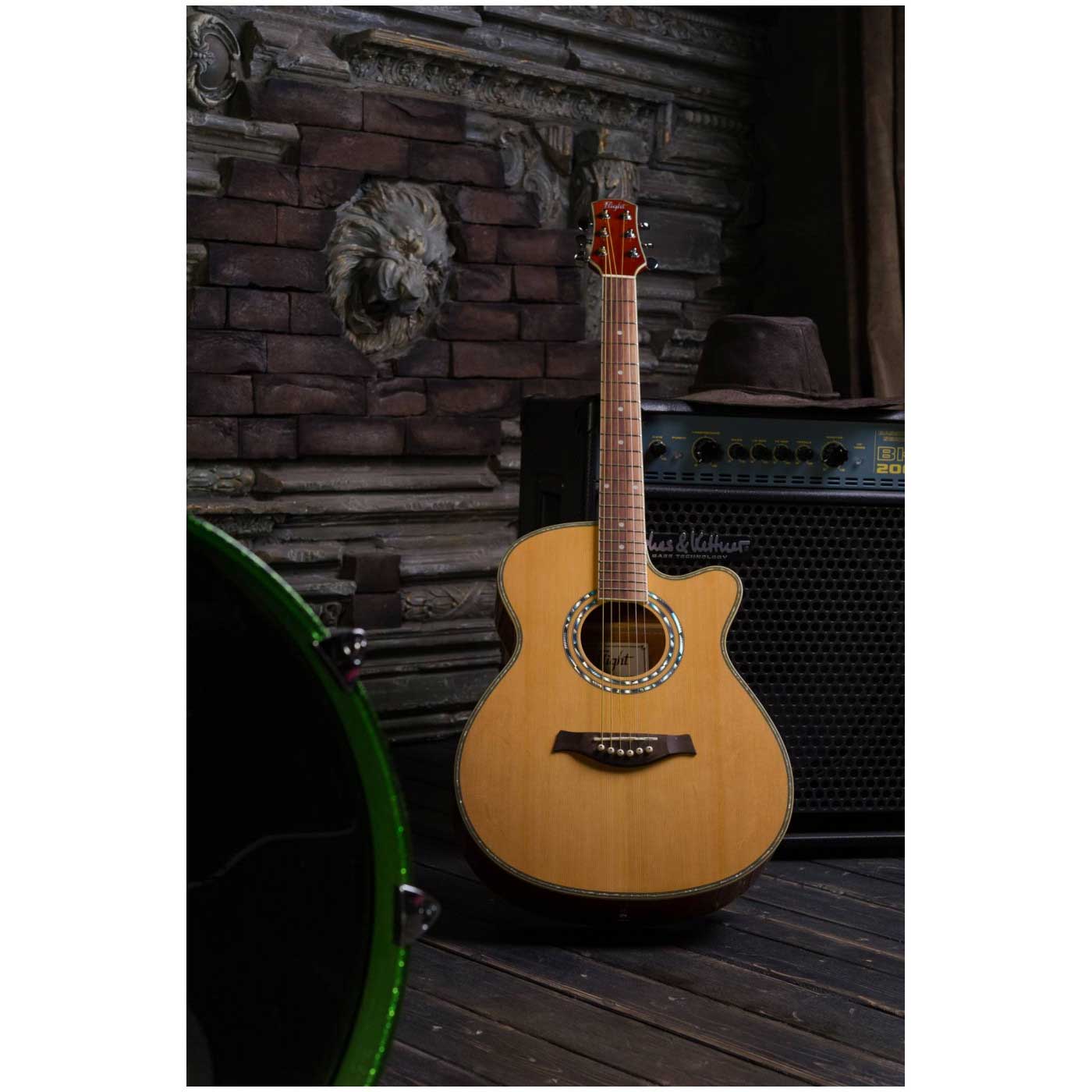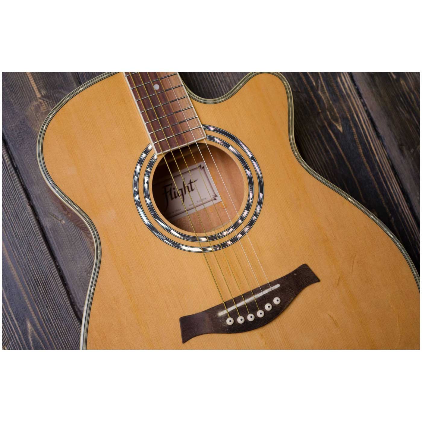 Это инструмент имеет стандартную для акустических гитар мензуру 651 мм и уменьшенный корпус. FLIGHT F230C отлично подойдет как начинающим гитаристам, так и в качестве второго инструмента для тех, кто уже умеет играть. Верхняя дека из ели придает инструменту яркое, звонкое, чёткое и ровное звучание. Нижняя дека и обечайка выполнены из агатиса, который обладает хорошими резонансными характеристиками. Гриф изготовлен из окоуме, подставка и накладка на гриф - кабукалли. Размер корпуса FLIGHT F230C немного меньше, чем у гитар с корпусом типа «дредноут» или «вестерн». Он ближе к размеру классической гитары, при этом на инструменте установлены металлические струны, которые дают такой любимый всеми яркий звук, а вырез внизу корпуса обеспечивает удобный доступ к верхним ладам. Два хромированных держателя позволят быстро и надежно закрепить ремень без использования дополнительного шнура. Двойное кольцо перламутрового цвета на розетке гармонично сочетается с перламутровой окантовкой на верхней деке. Инструмент выполнен в классическом натуральном цвете и глянцевой отделке.