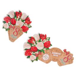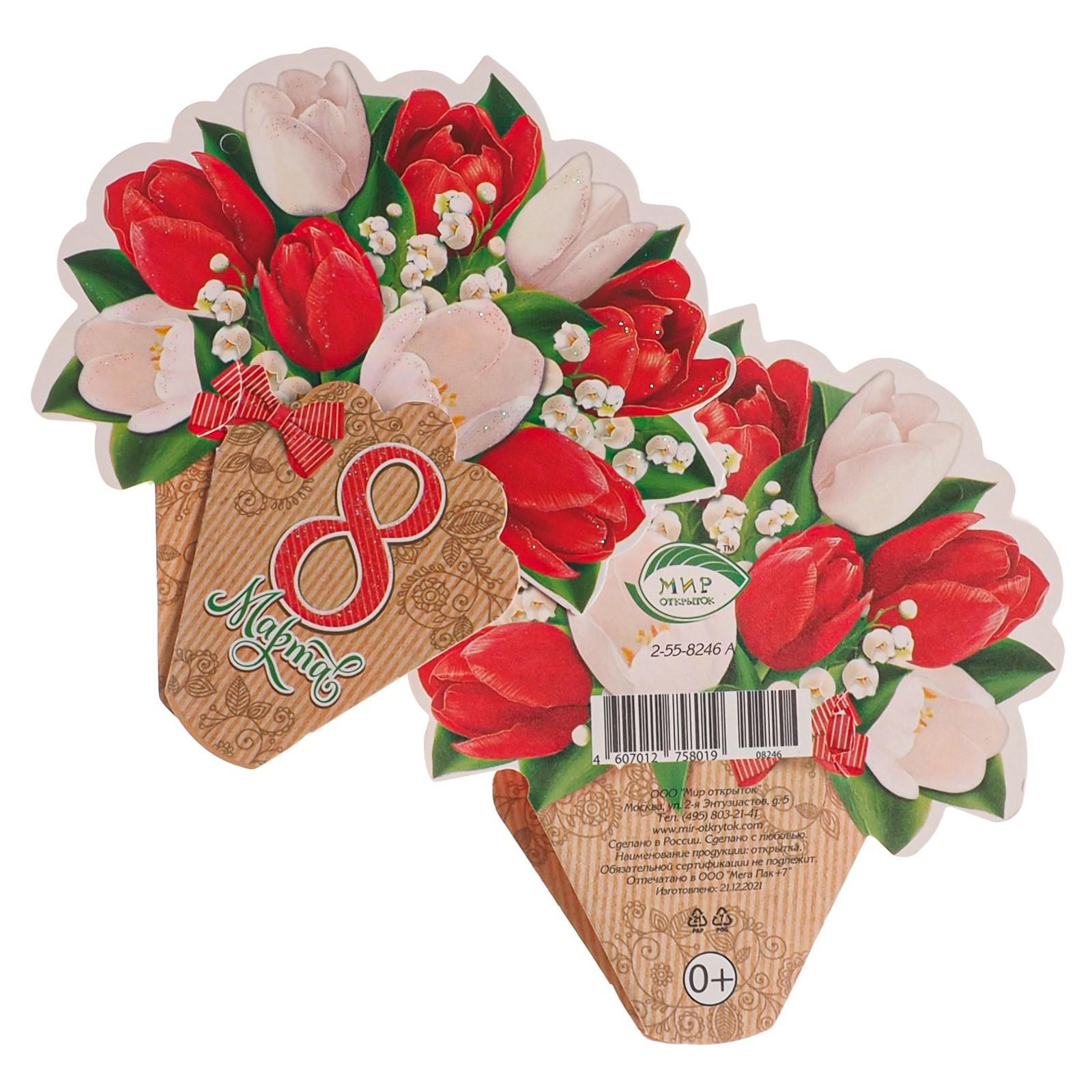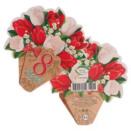 Открытка-мини двойная "8 марта" глиттер, красные и белые цветы, 11,5 х 11 см