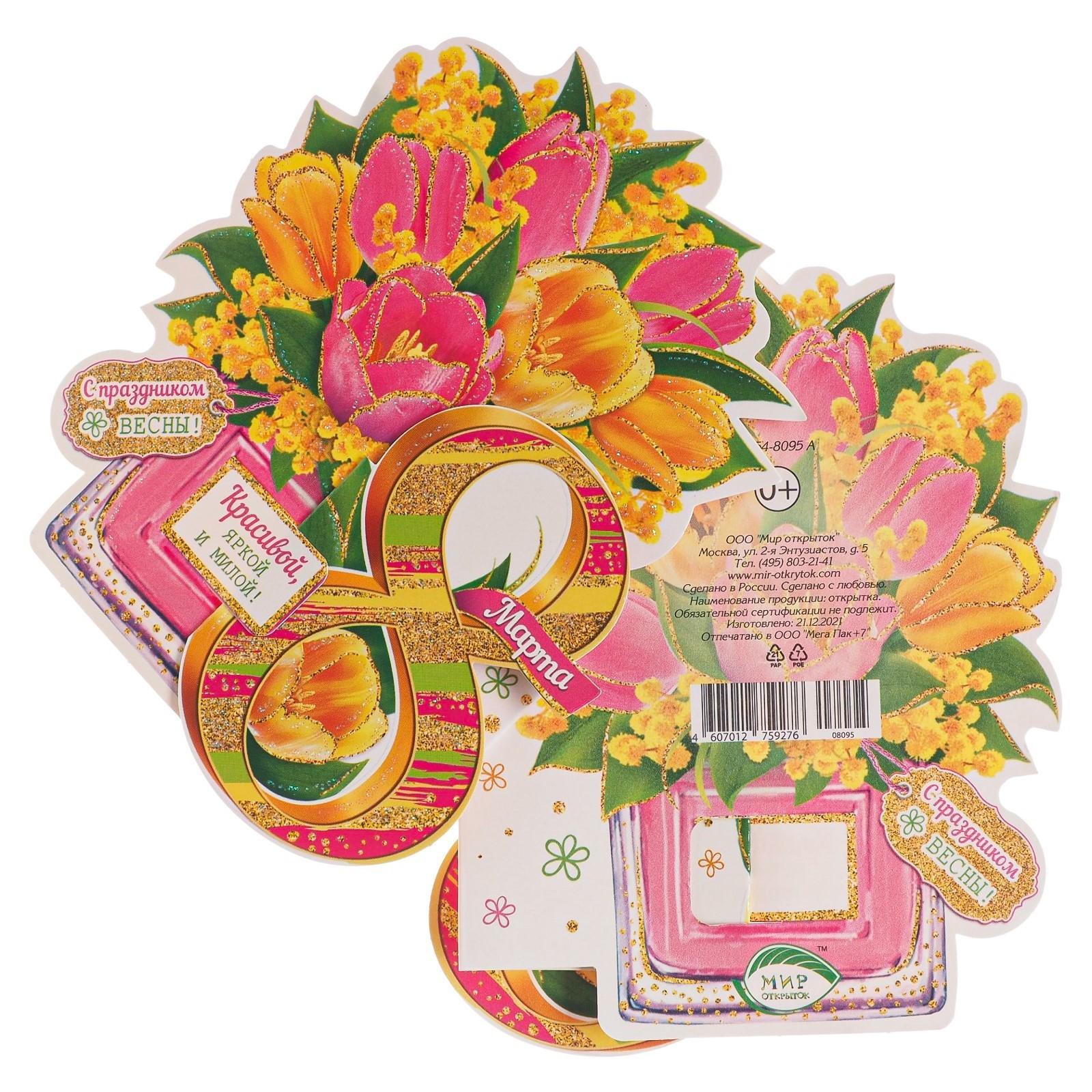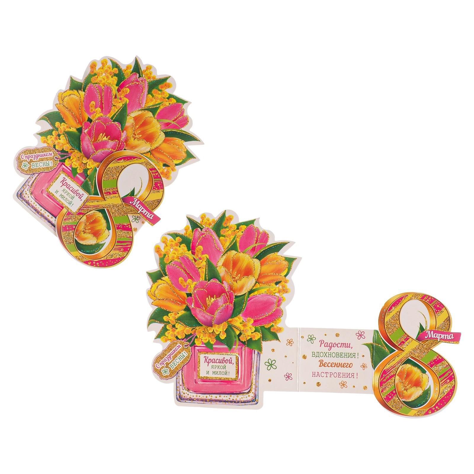Открытка-мини двойная "8 марта" глиттер, желтые тюльпаны, 14 х 13 см