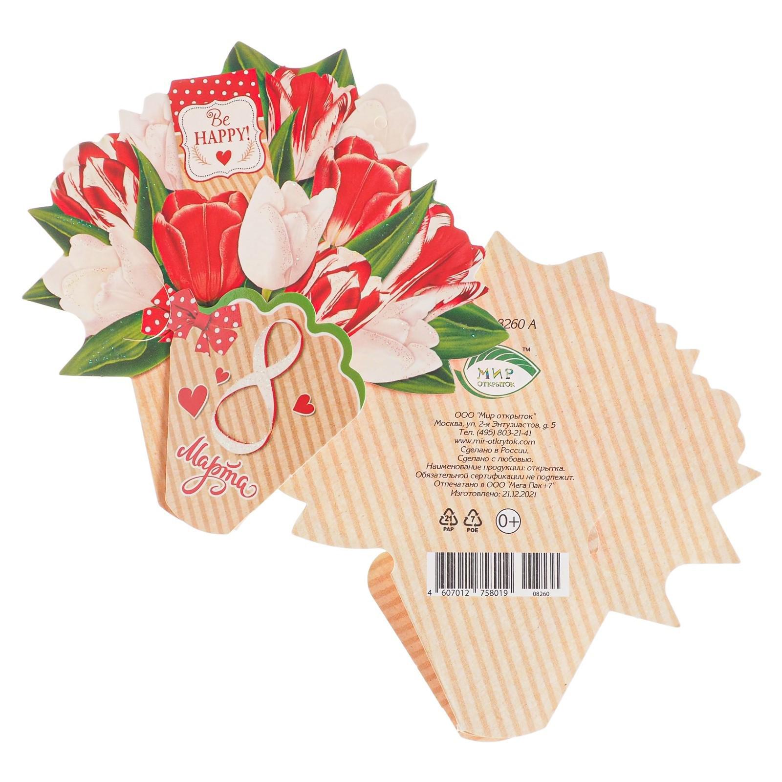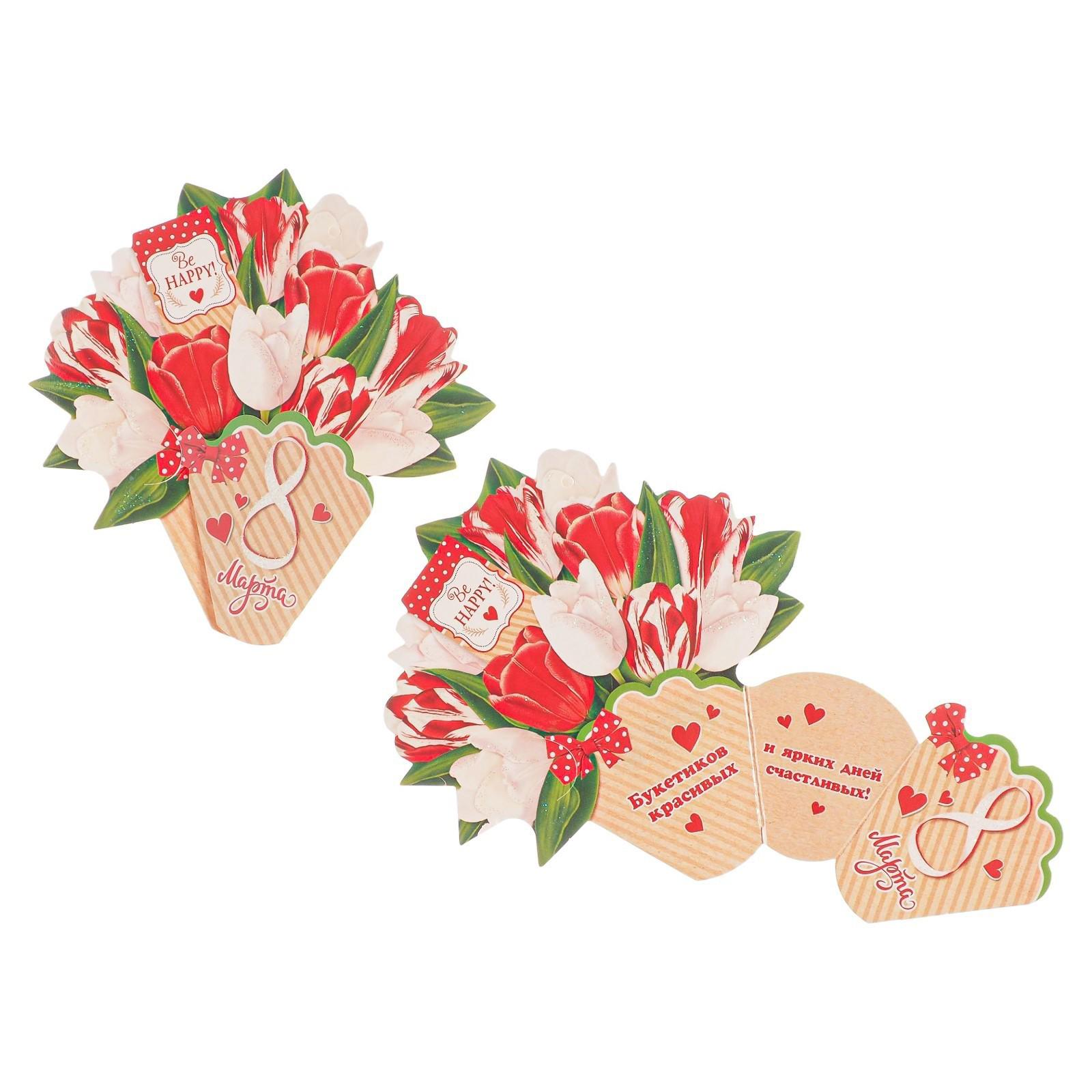 Открытка-мини двойная "8 марта" глиттер, цветы, бантик, открытка, 11,5 х 11 см