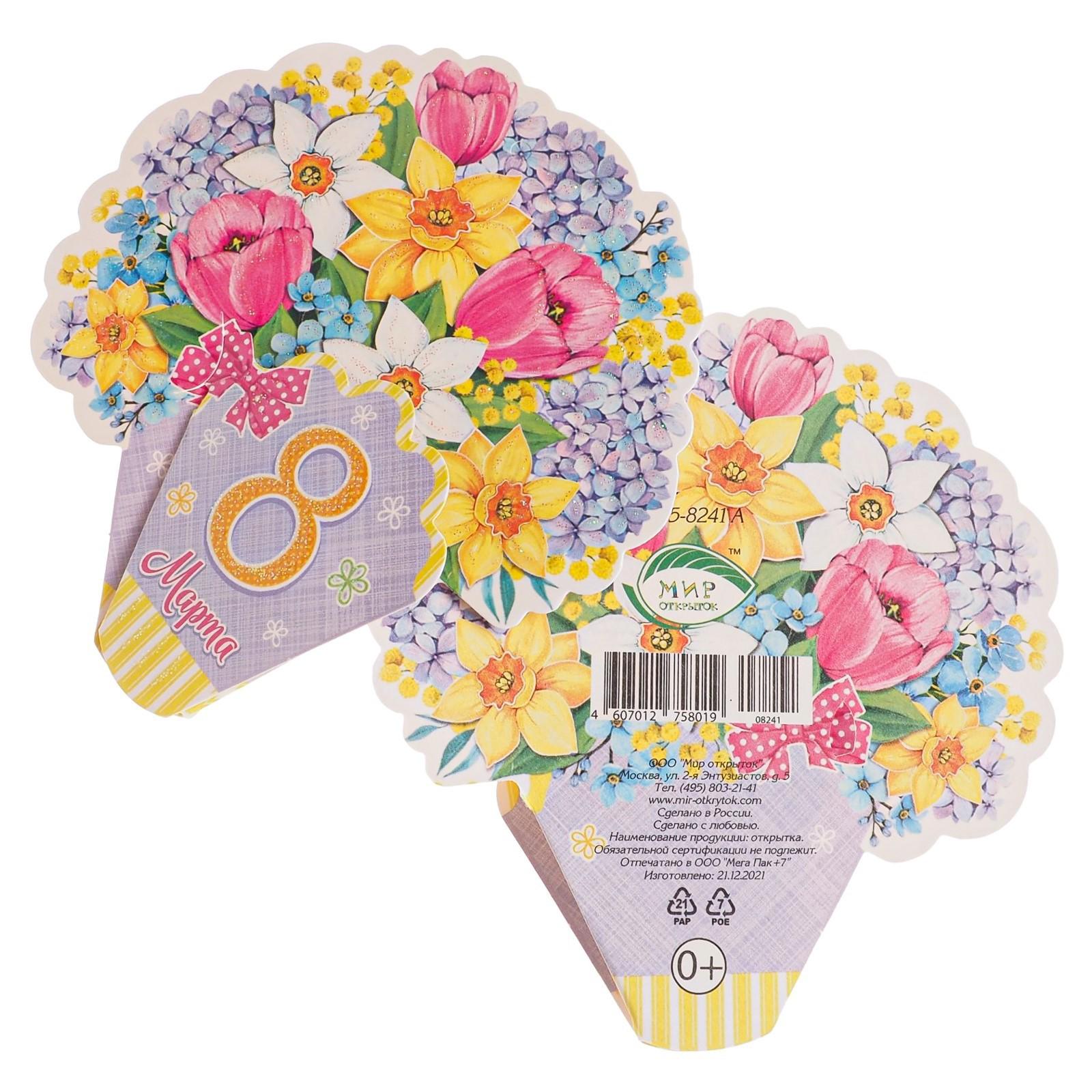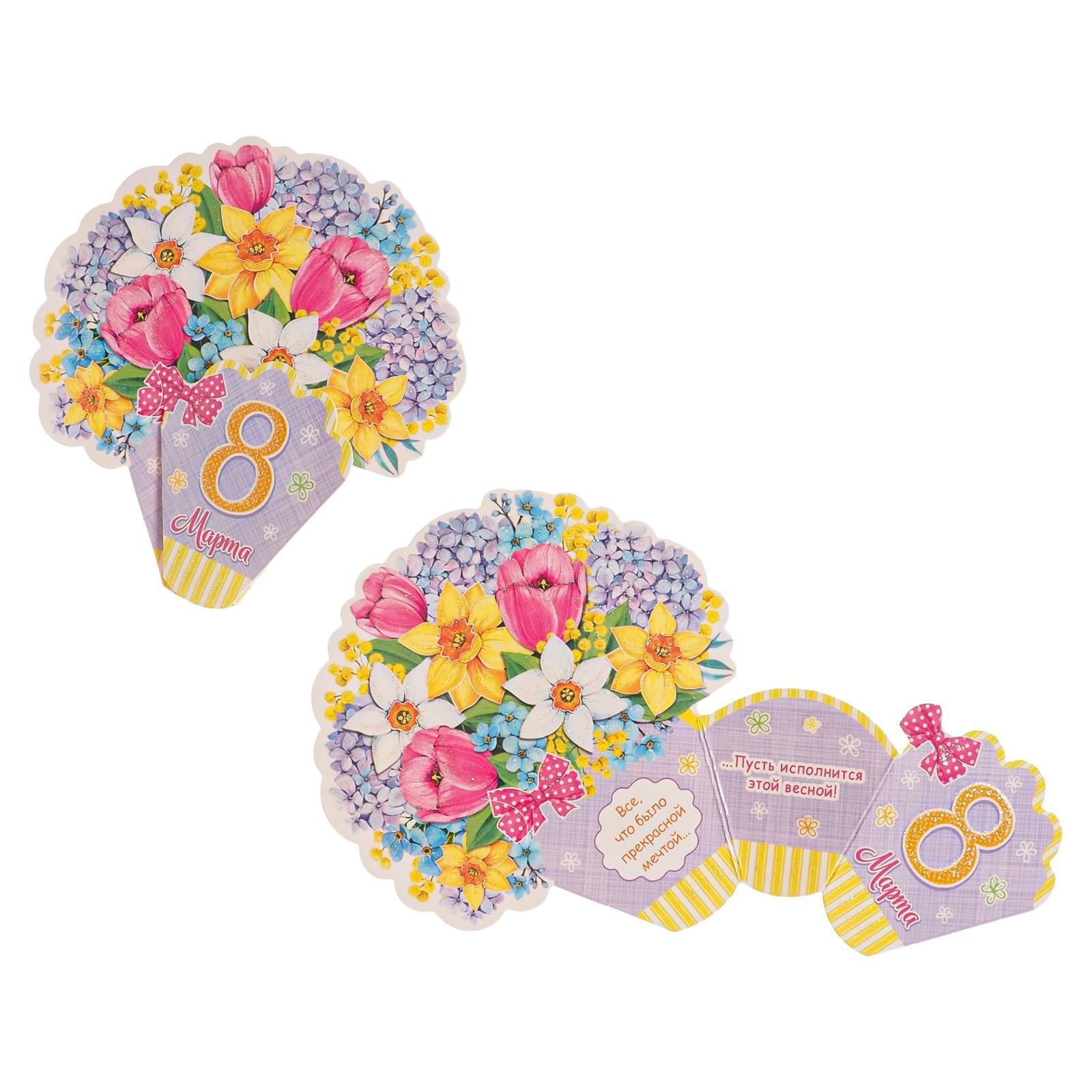 Открытка-мини двойная "8 марта" глиттер, букет цветов, 11,5 х 11 см