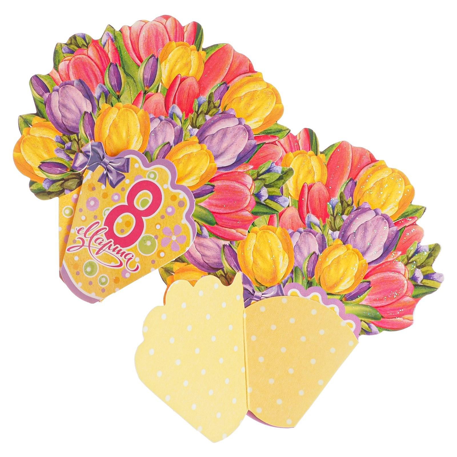 Открытка-мини двойная "8 марта" глиттер, букет цветов, желтый фон, 11,5 х 11 см