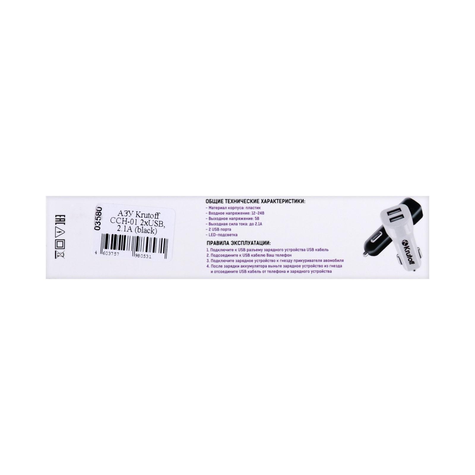 Автомобильное зарядное устройство Krutoff CCH-01, 2xUSB, 2.1 A, черное