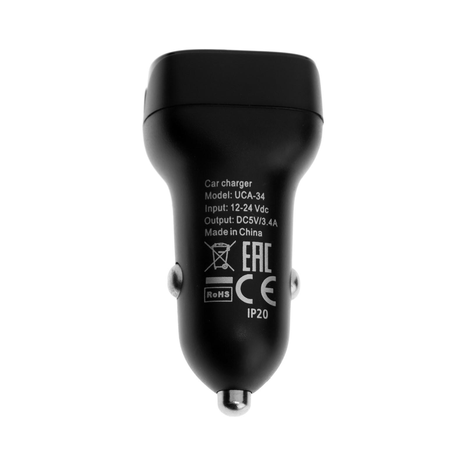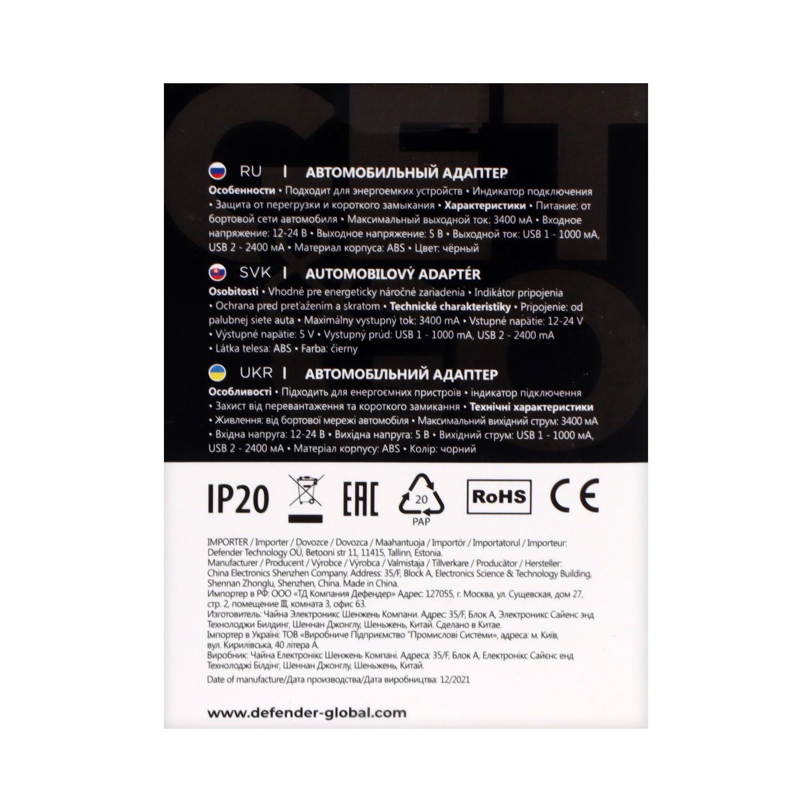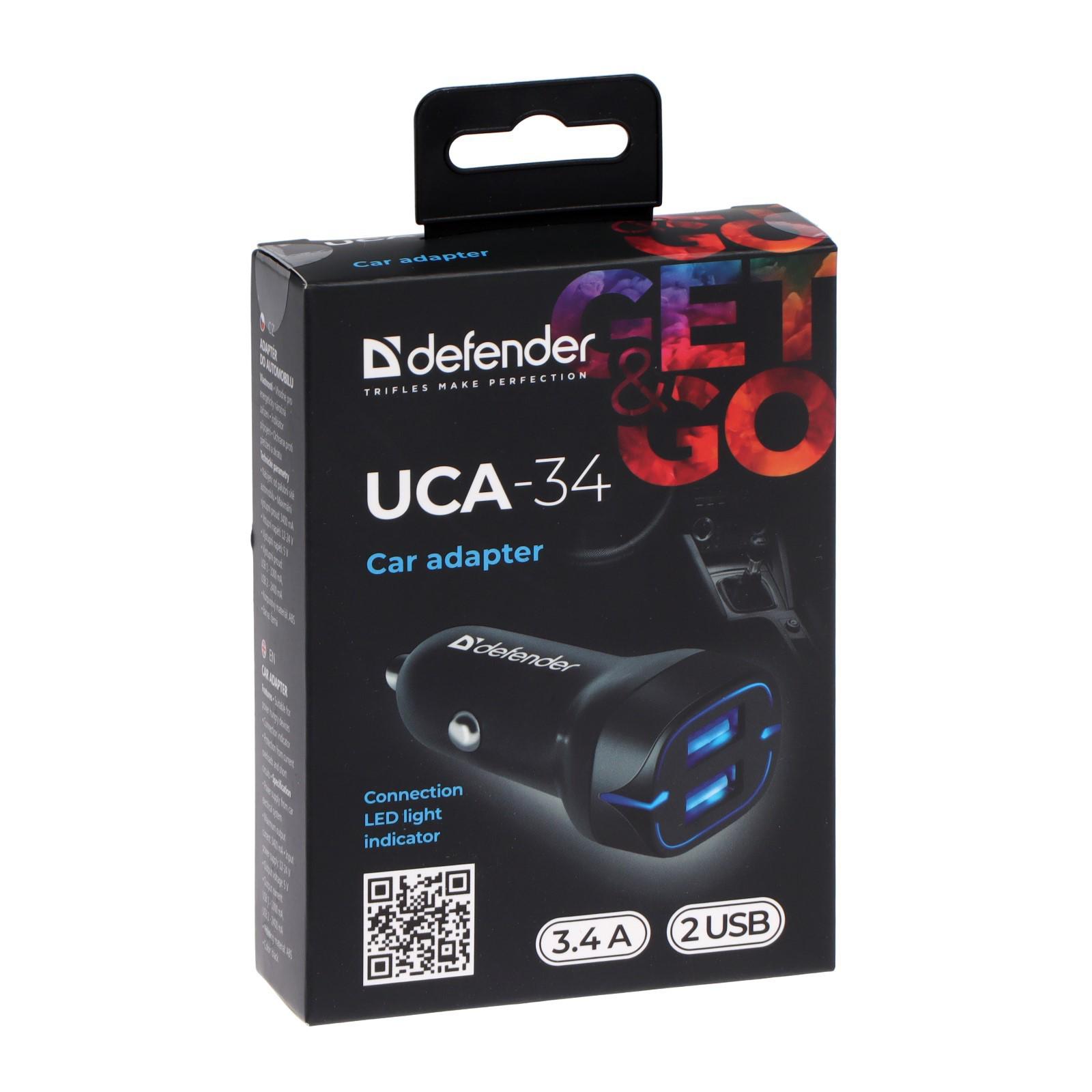 Автомобильное зарядное устройство Defender UCA-34, 2 USB, 3.4 А, индикатор, черное