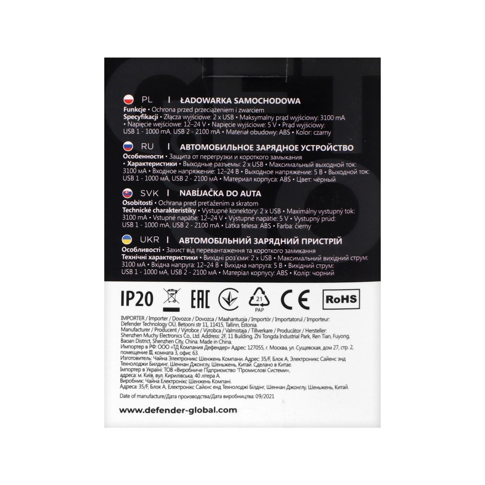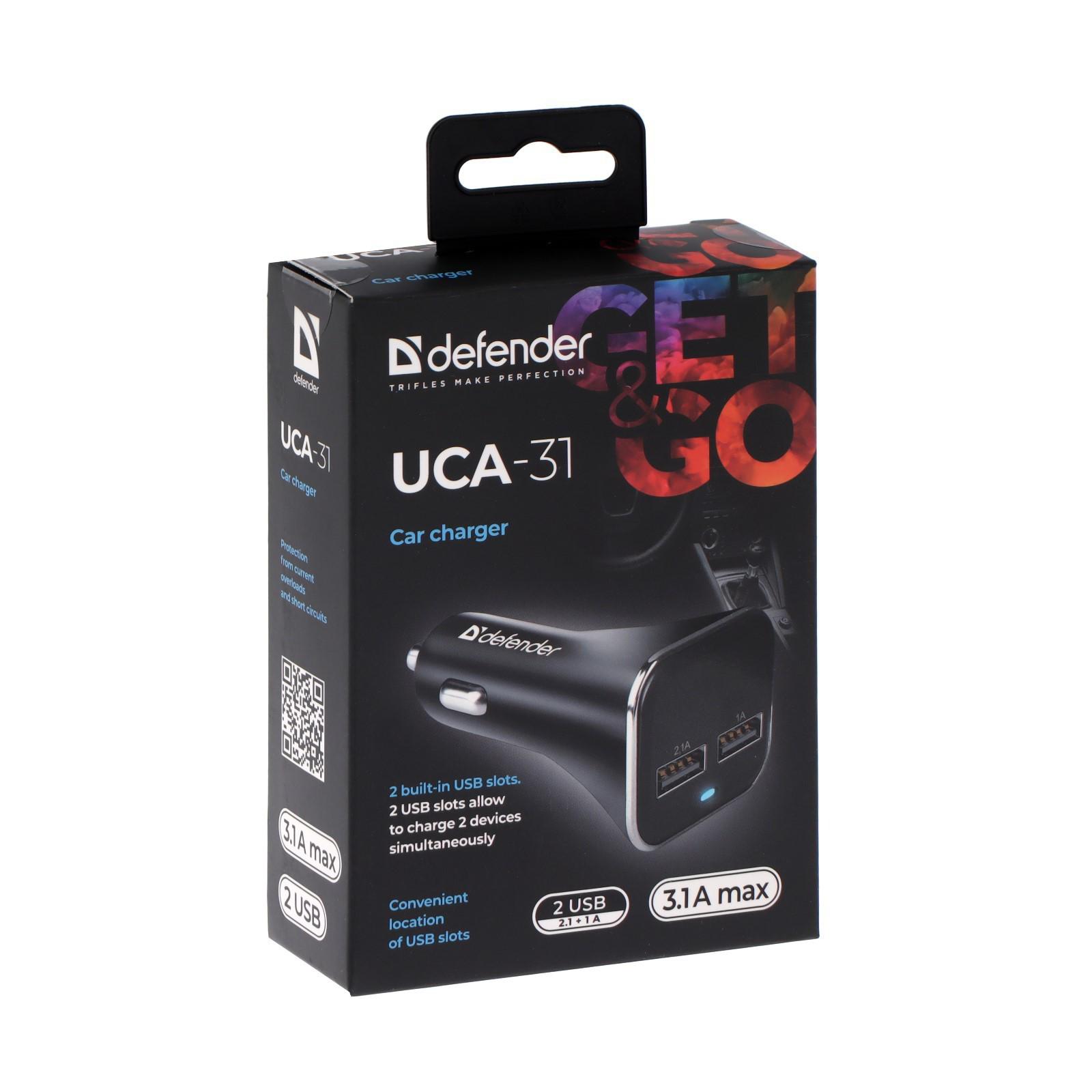 Автомобильное зарядное устройство Defender UCA-31, 2 USB, 3.1 А, индикатор, черное