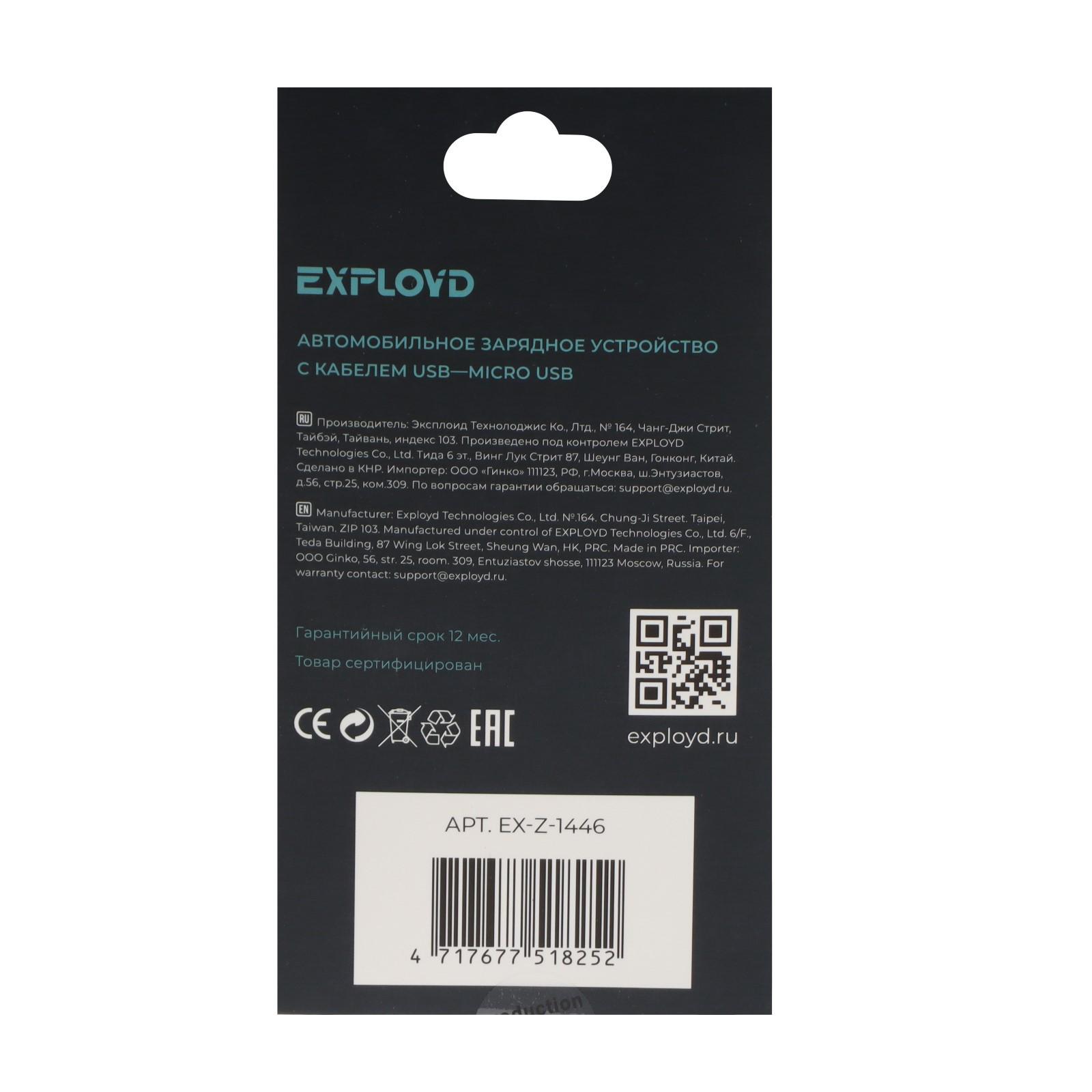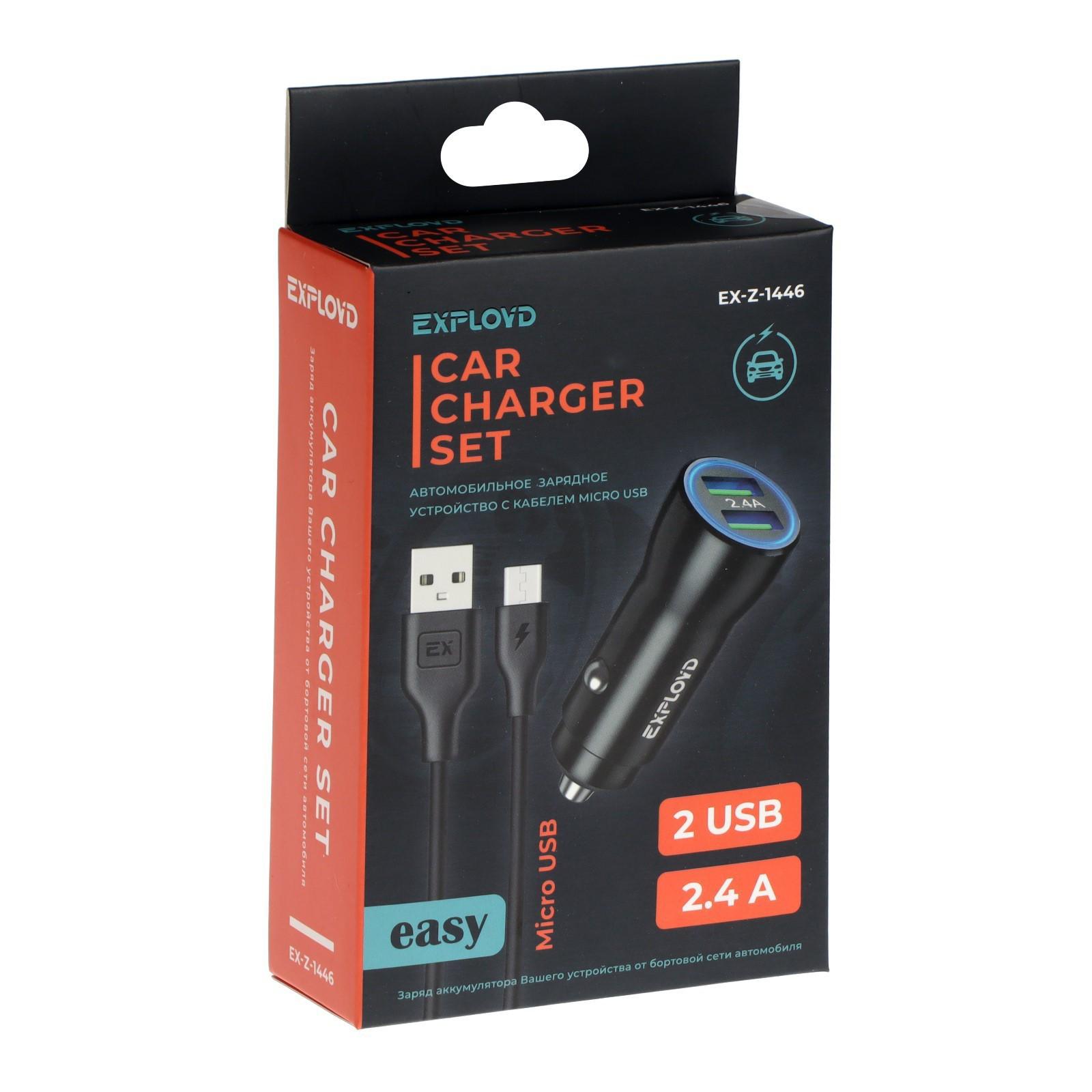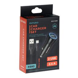 Автомобильное зарядное устройство Exployd EX-Z-1446, 2 USB, 2.4А, кабель microUSB, 1м,черное
